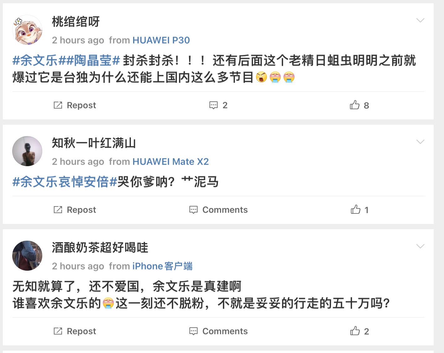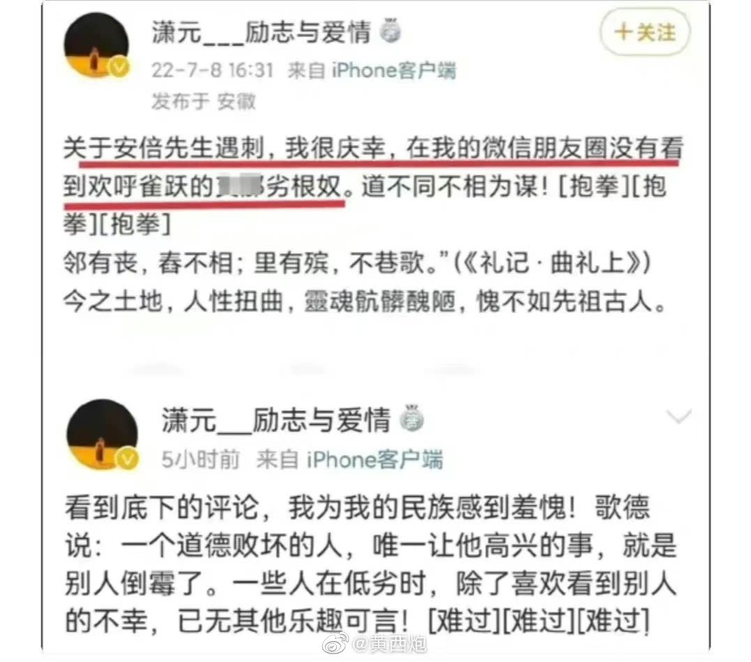 以极端民族主义言论频频引发激烈争议的网络“大V”、台湾歌手黄安就在微博上留下“凡是跟中国过不去的,是没有好下场的!”,以及“善恶终有报,天道好轮回,不信抬头看,苍天饶过谁。乾杯!好日子!”等言论。而当网友引用《礼记》“里有殡,不巷歌”要黄安检讨和反思时,他则回击,“2022年,一个敌人的死亡,凶手还是它们自己人,你管我唱不唱歌?”