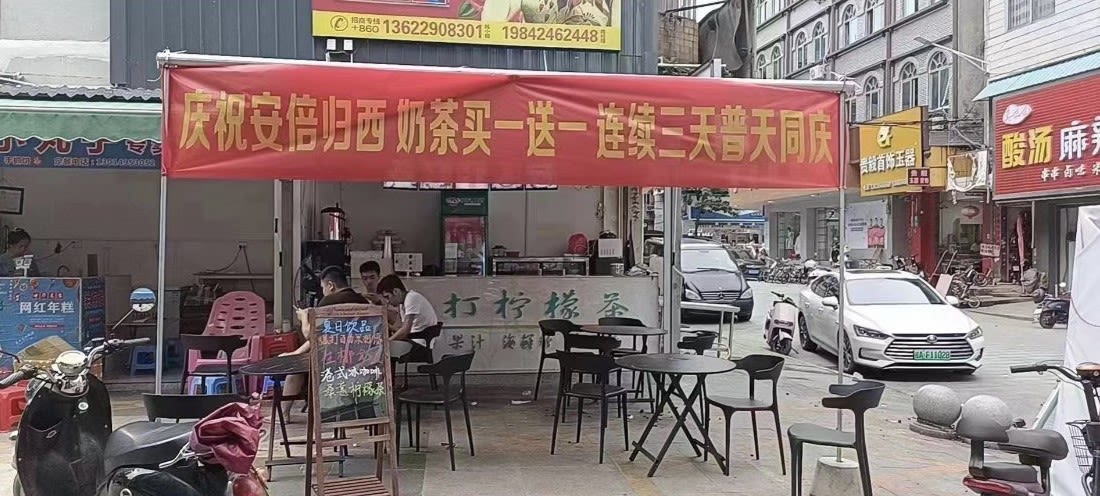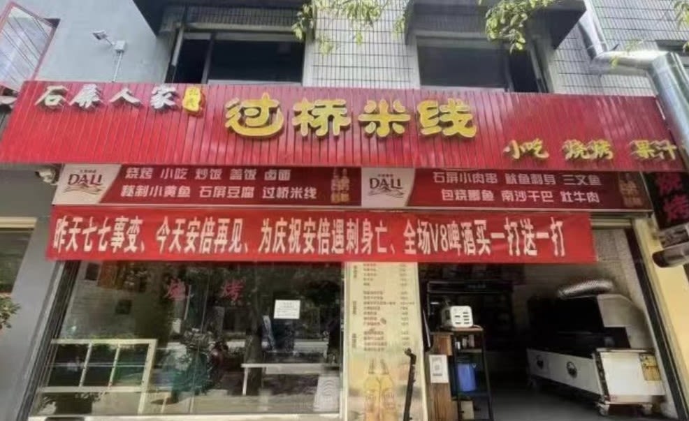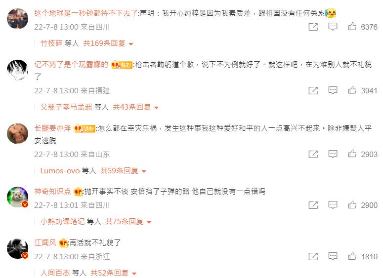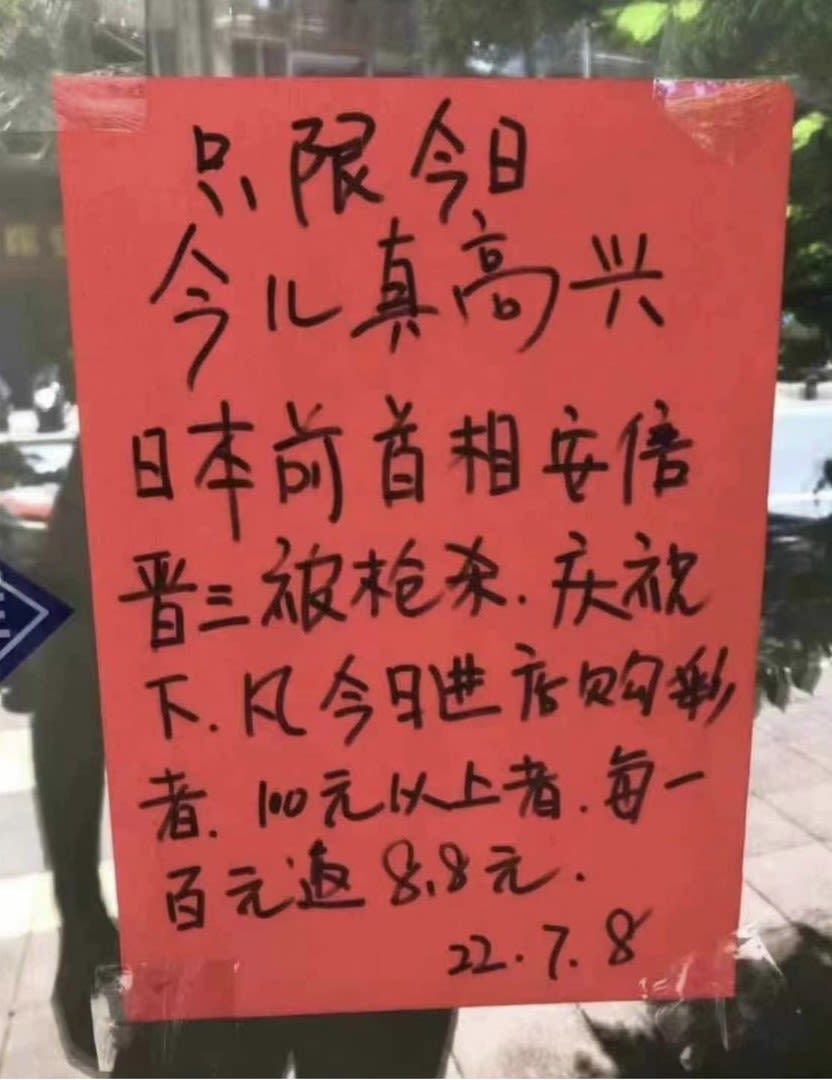 在有关安倍遇刺报导的评论区,“墓前状态良好”、“普天同庆”、“发来贺电”、“千万别不死”等嘲笑和庆祝的评论比比皆是。微博上有不少网友,将刺杀安倍的凶嫌称为“孤勇者”、“英雄”。由于事件正发生在“七七卢沟桥事变”后一天,不少商家借此促销。有店家挂上“昨天七七事变,今天安倍再见”的横幅,推出买一送一促销活动“庆祝”安倍遇害。有夜店举办“安倍灵堂”电音派对,人们在舞池狂欢,背景挂着安倍的黑白照片。