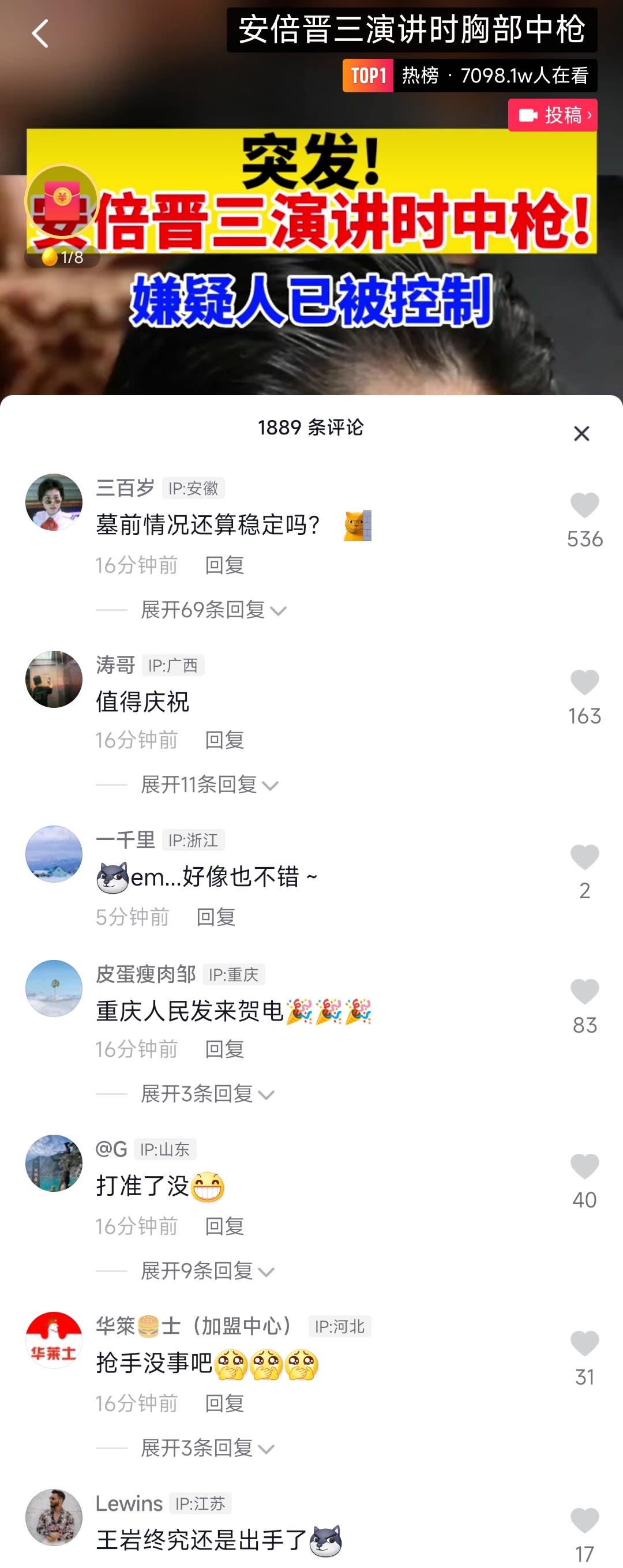 “安倍遇刺”新闻下网友的评论(作者提供)
