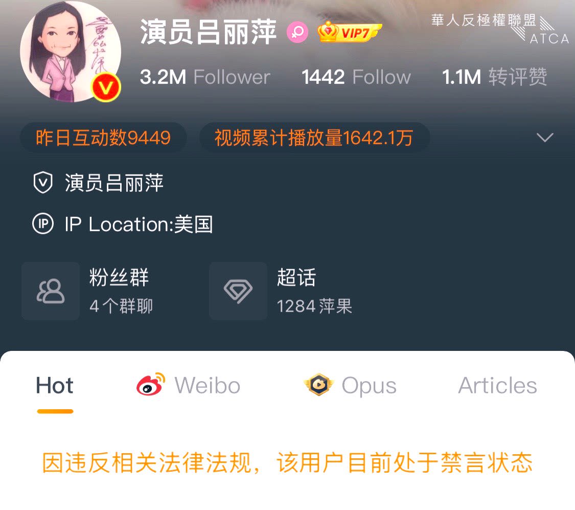 发微博悼念安倍的演员吕丽萍被禁言(作者提供)