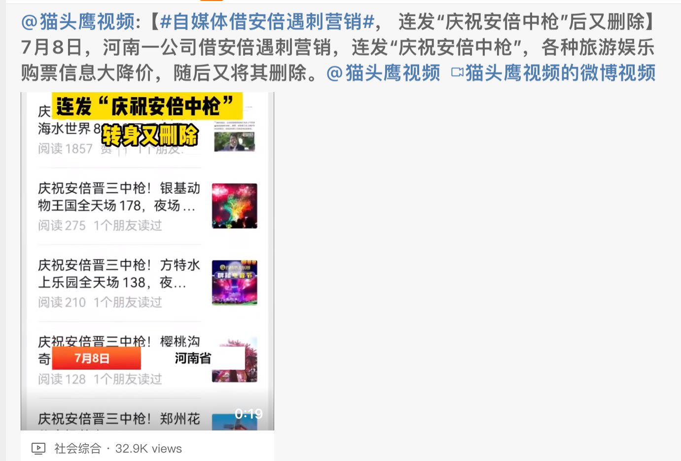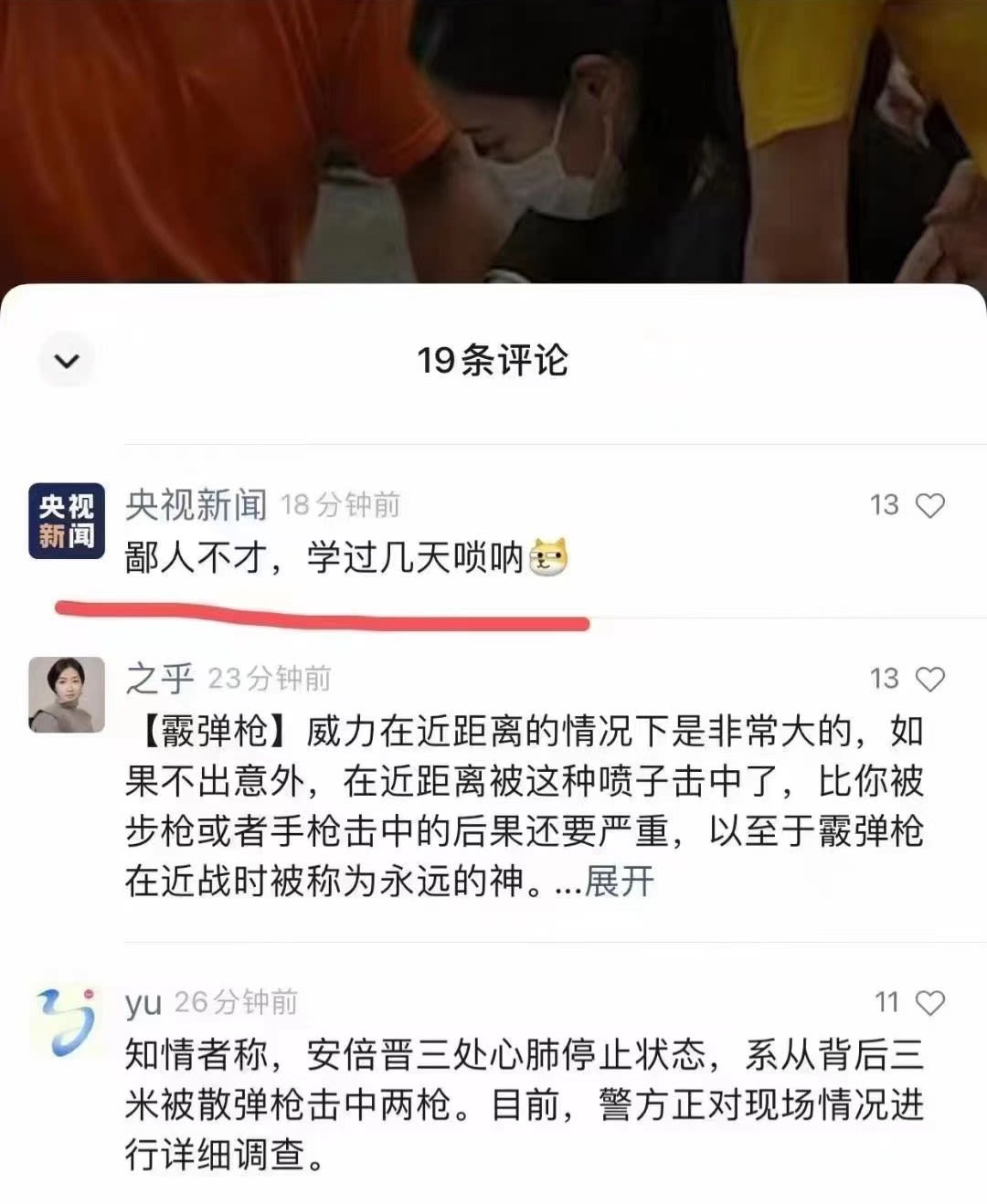 枪杀案发生的当天,路透社记者在中国外交部例行记者会上询问发言人赵立坚,“对中国网友们对安倍遭遇枪击的评论有何看法”,赵回应“不予置评”。同一时间,官方社媒帐号在安倍遇刺的第一时间留下极具挑衅和幸灾乐祸的评论:“央视新闻”留言:“鄙人不才,学过几天唢呐。”;河南共青团则上传有关霰弹枪威力的视频(安倍遇刺之初,有消息指凶嫌使用的是霰弹枪),并留言“《 非 常 好 用 》”。同时,有无法证实来源的消息指,多个对安倍之死表达哀悼和对“幸灾乐祸”言论表达愤慨的帖子和文章遭言论审查部门删除、封锁或禁止评论,显示在安倍遇刺的议题上或有公共讨论操纵。