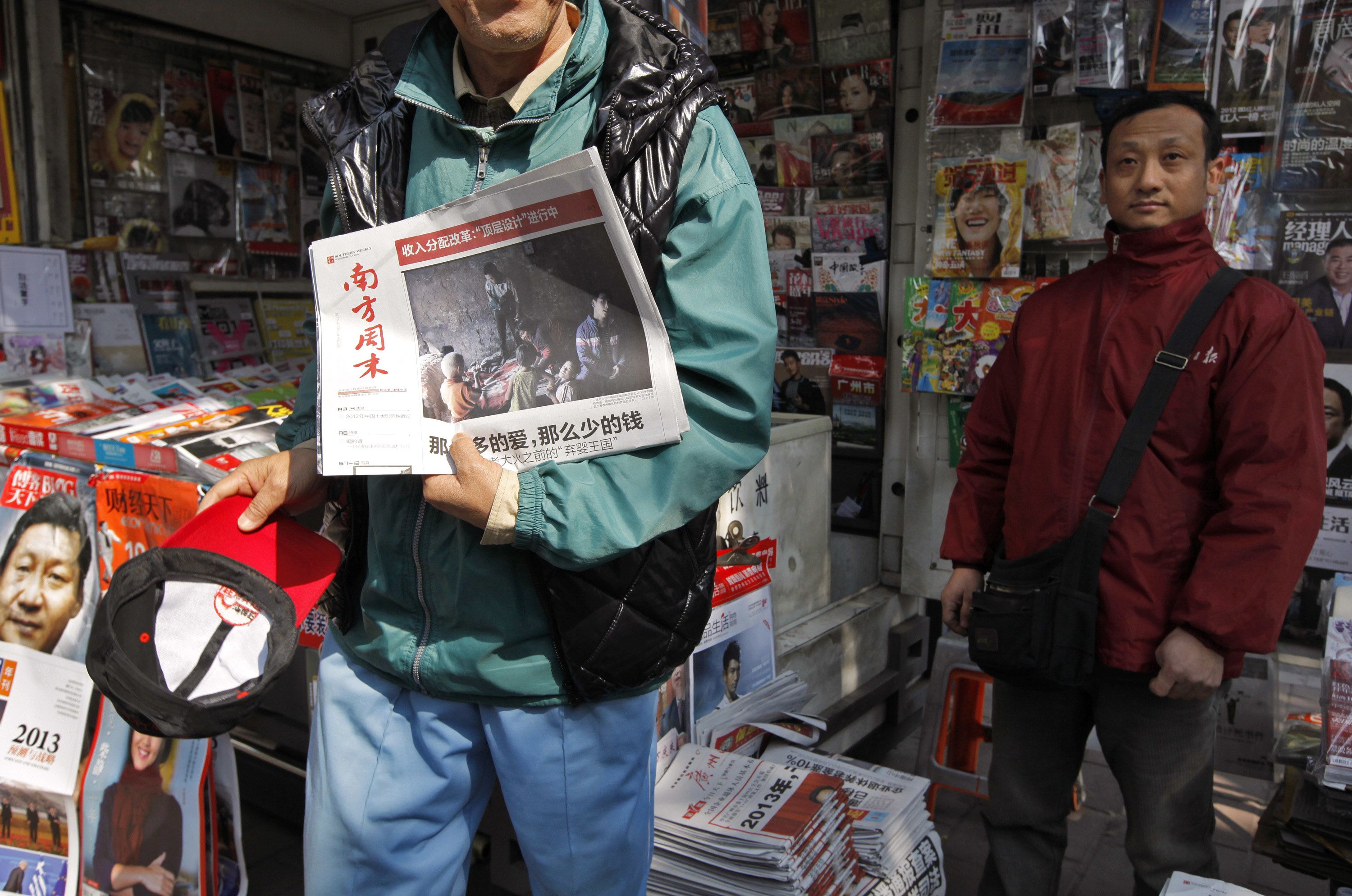 2013年的1月10日,《南方周末》新年特刊事件后,一名男子举着最新一期的报纸。这期《南方周末》用小篇幅探讨了党管媒体和新闻宣传等问题。(AP/ Vincent Yu)