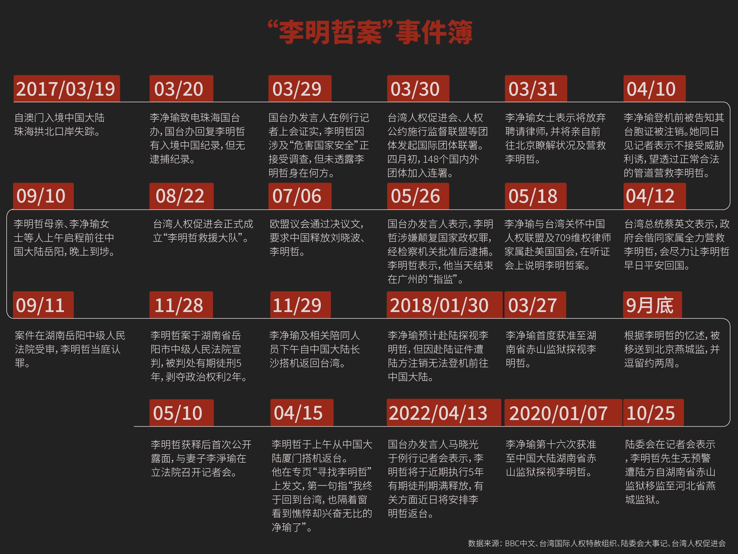 2017年3月19日,李明哲入境中国后失踪,后被中国控以“颠复国家政权罪”,经审判后罪成,判囚五年。从前低调的名字,赫然出现在报纸的头条和电视媒体上,在“寻找”、“释放”的海量讯息中,世界都在期盼这个台湾人能及早回家。