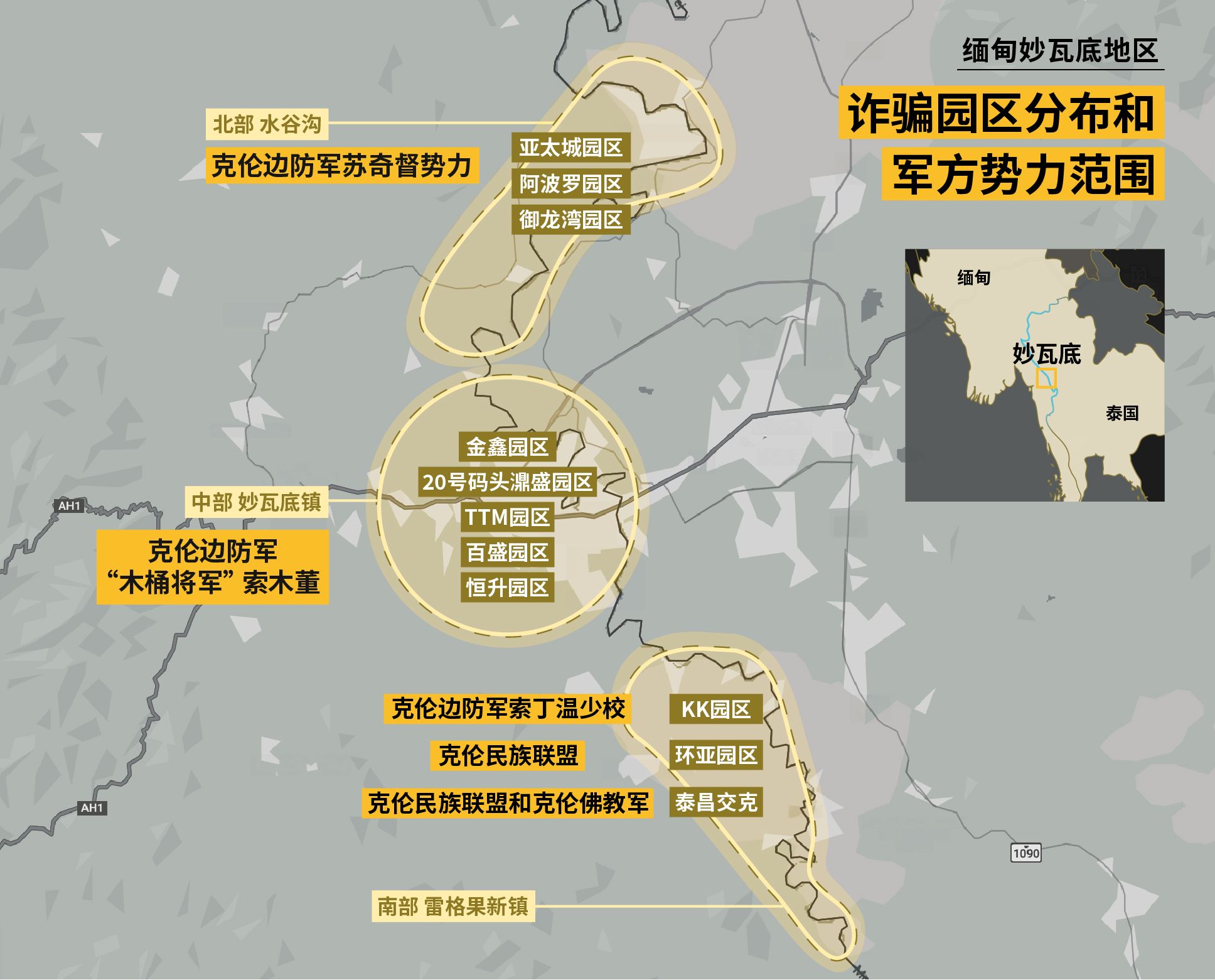 克伦边防军(BGF)是秒瓦底地区电诈园区的主要保护伞:缅甸妙瓦底分为北、中、南三大区,苏奇督的势力范围的北部水沟谷的亚太城亚太经济特区、阿波罗园区、御龙湾;中部妙瓦底镇则是“木桶将军” 索木董(ဗိုလ်မုတ်သုန်- Saw Moe Tone)的天下,这里有金鑫园区、20号码头濎盛园区、TTM园区、百盛园区、恒升园区....南部为KK园区提供安保的则是索丁温少校(ဗိုလ်တင်ဝင်း- Saw Tin Wen)南部的环亚园区得到了克伦民族联盟(KNU)的庇护、在更边缘的山区还有KNU以及克伦佛教军(DKBA)庇护的泰昌交克电诈园区。