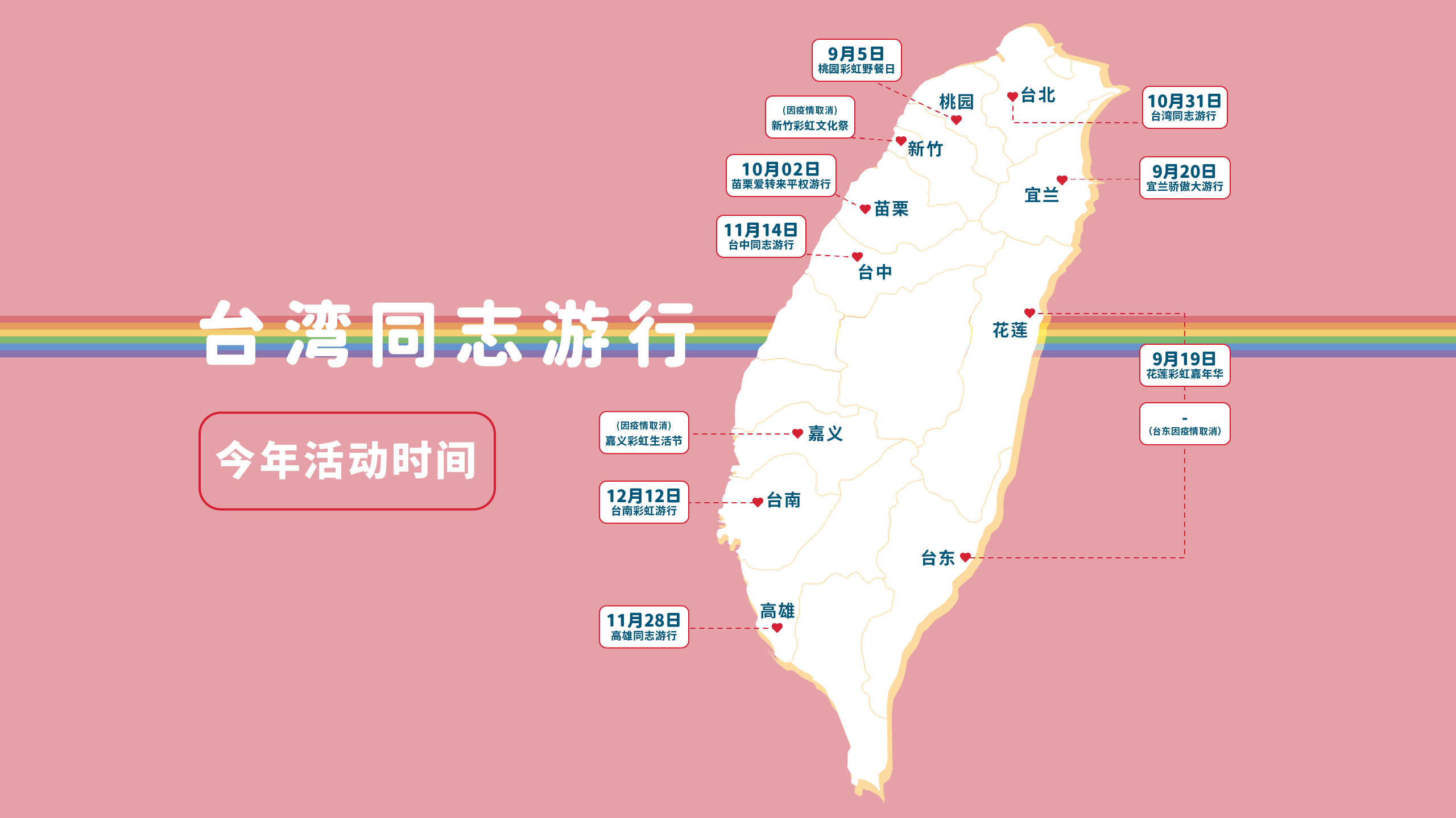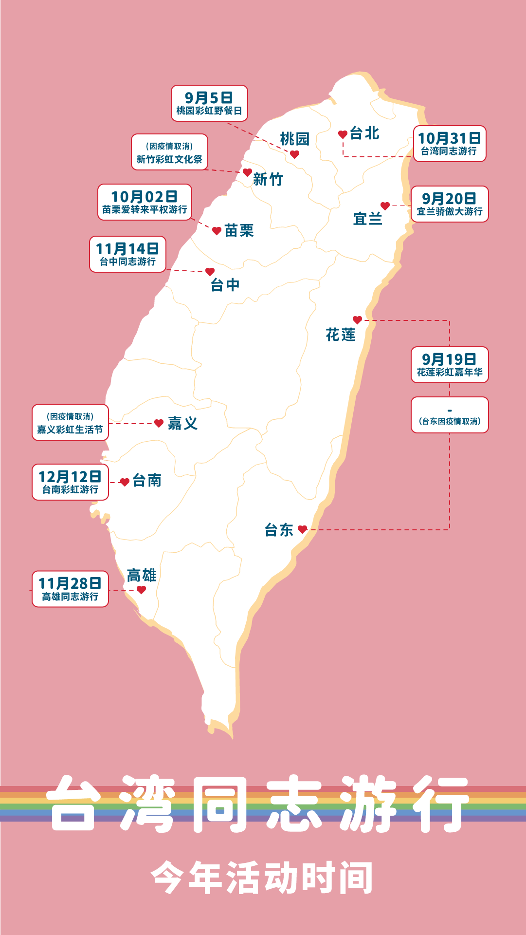 今年9月举办的花莲彩虹嘉年华(台中因疫情缘故取消)也喊出“洄+”(谐音“回家”)主题,同样表达了直面同志原生家庭、试图打造同志友善宜居城市的渴望。