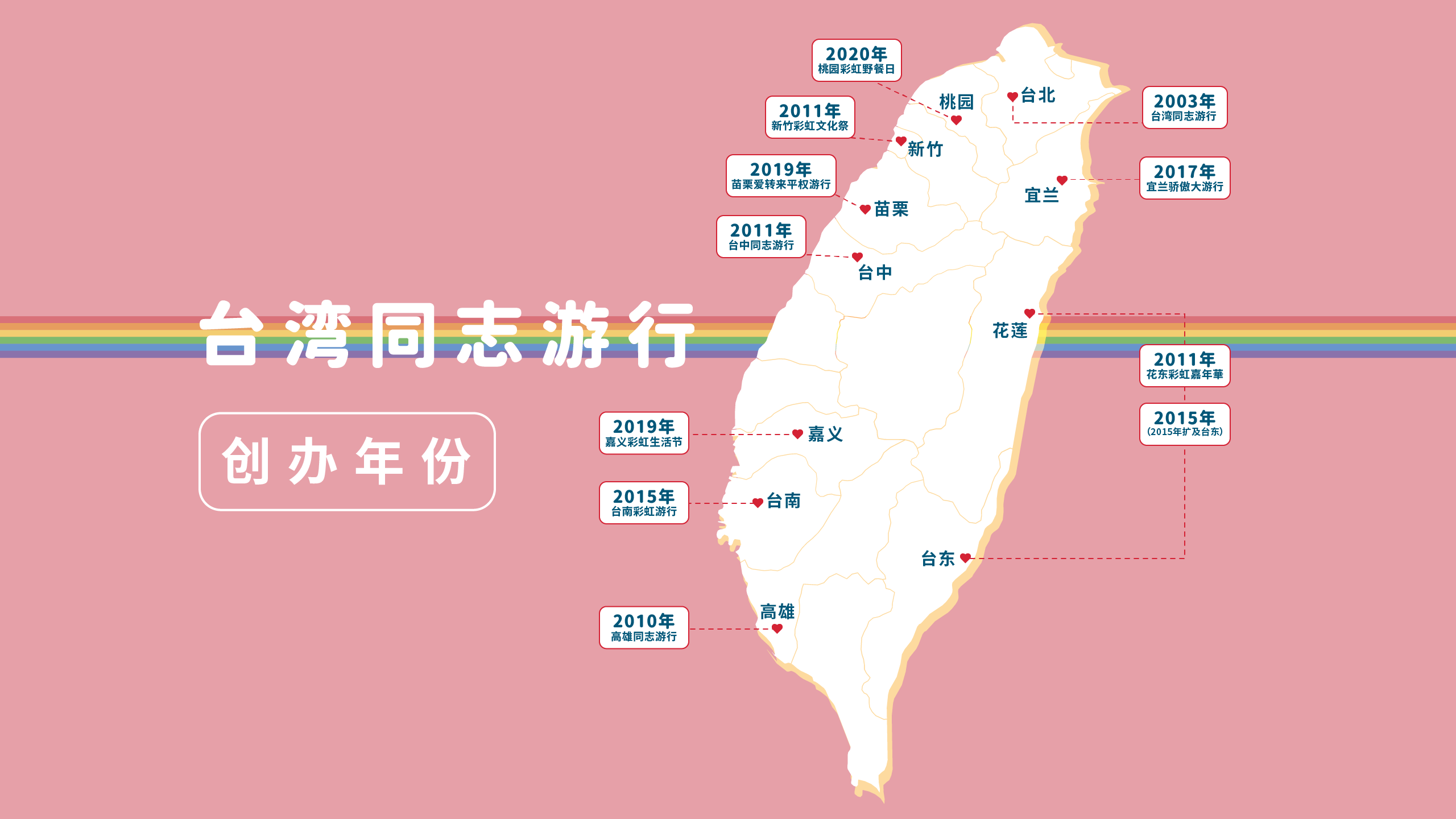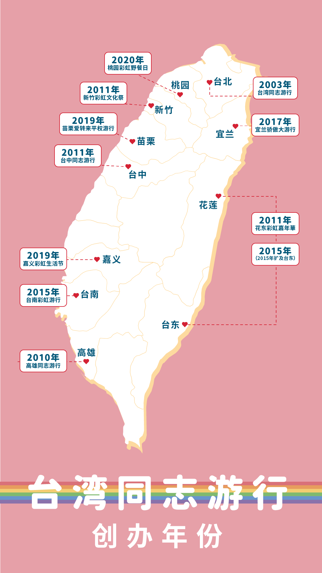 2011年,也就是高雄首次同志游行的次年,中台湾与东台湾也分别举行了“中台湾同志游行”(现“台中同志游行”)以及“花莲彩虹嘉年华”(现“花东彩虹嘉年华”)。
