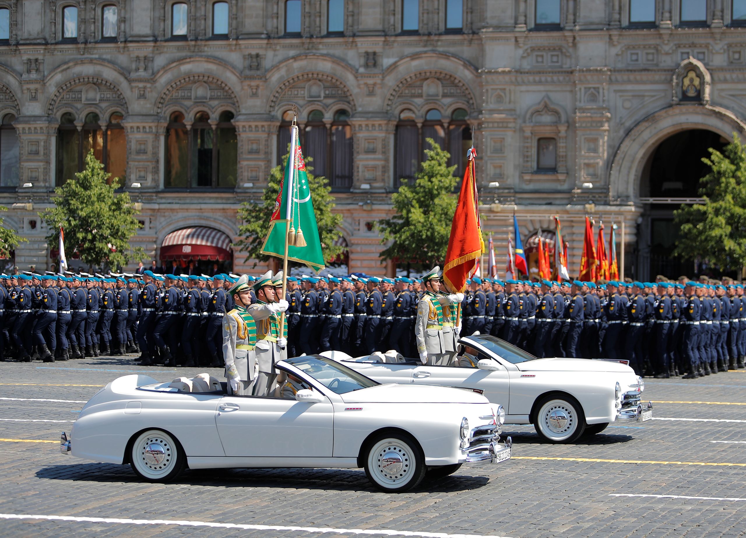 土库曼斯坦军驾驶白车参加胜利日阅兵式(图片来源:路透社)