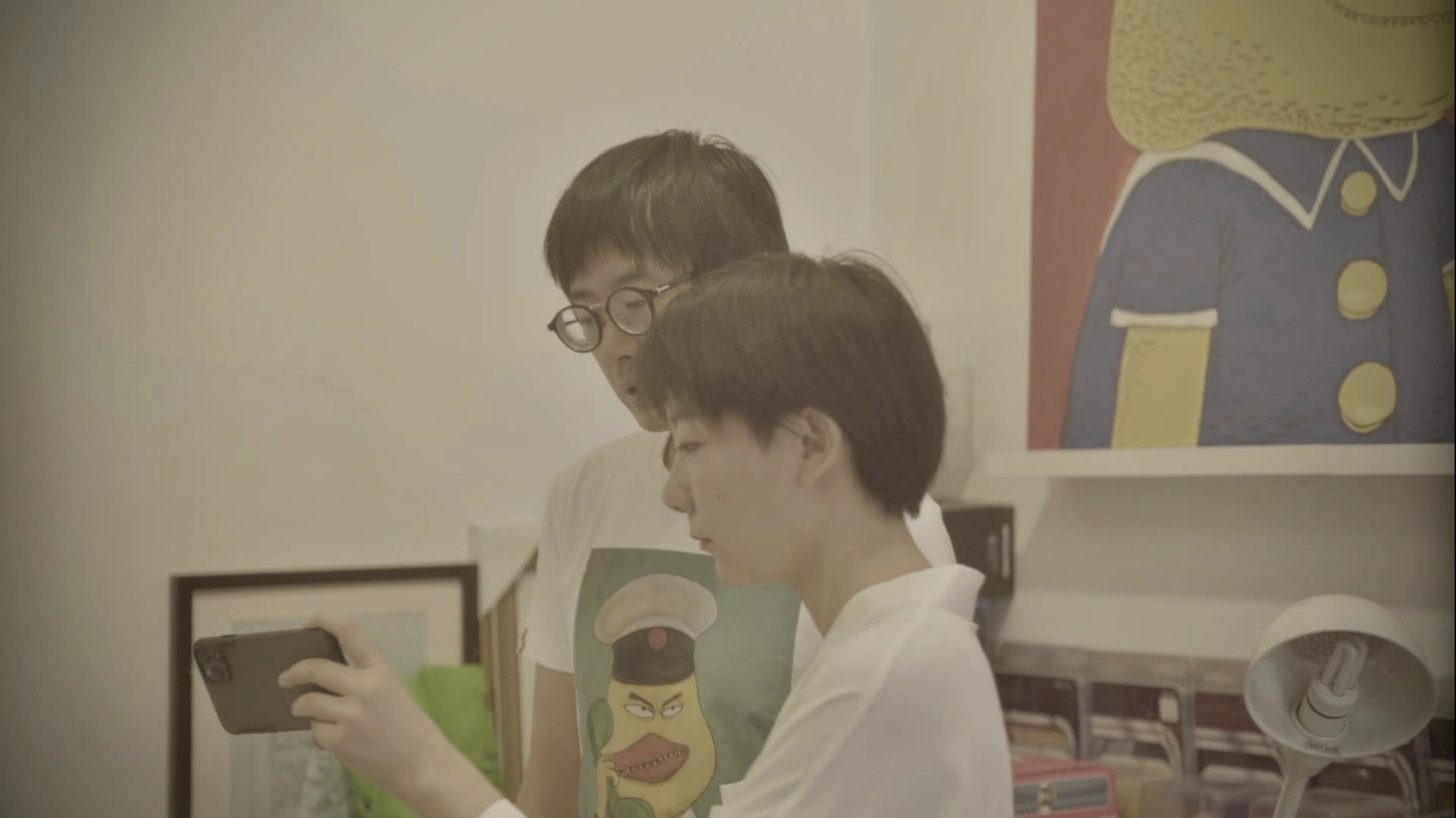 王嫣芸 和《国产》的拍摄嘉宾、新裤子乐队彭磊一起看视频。(受访者提供)