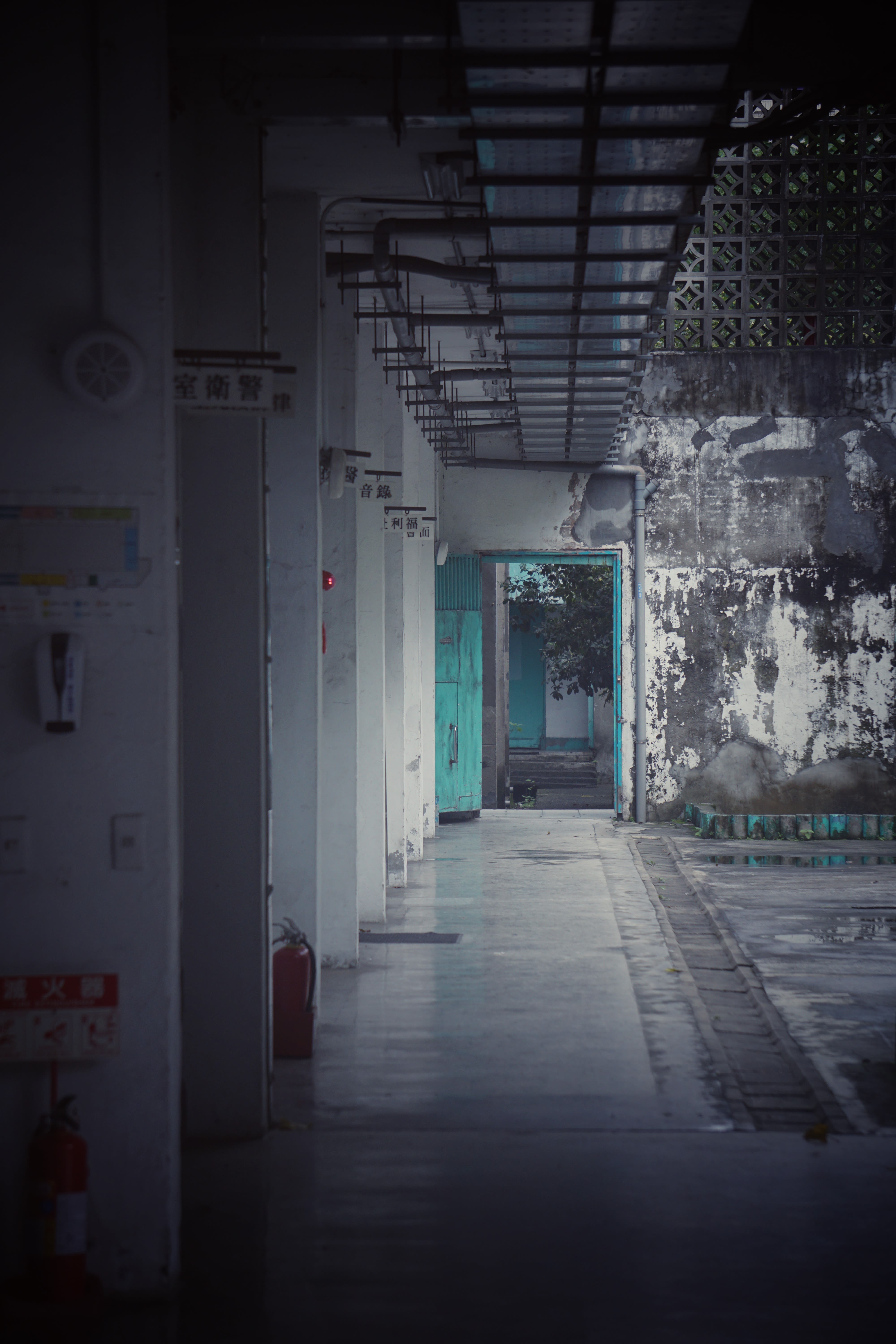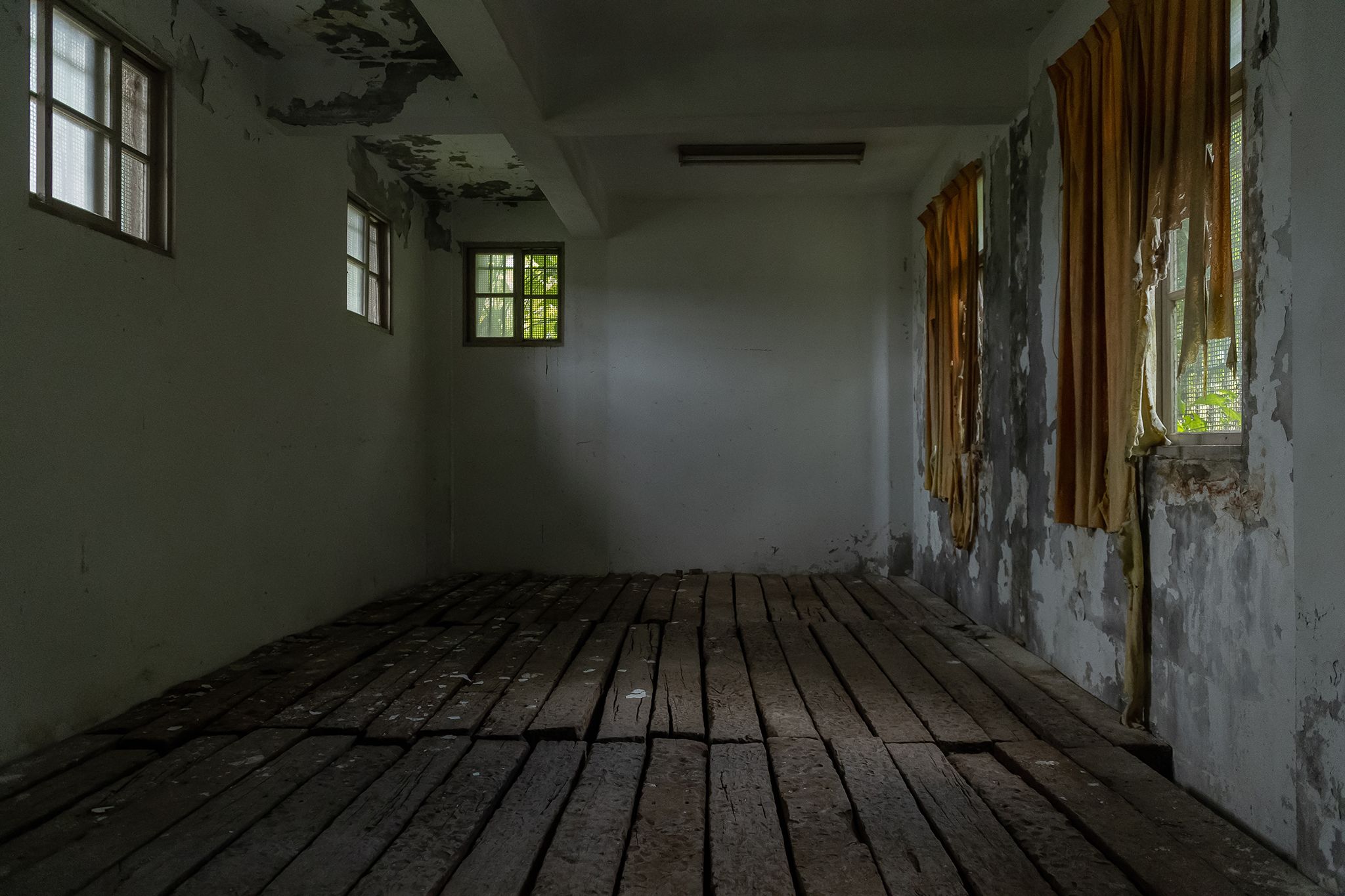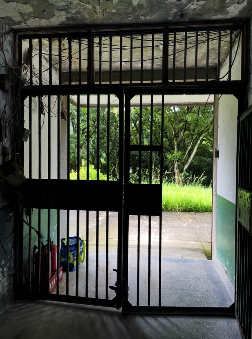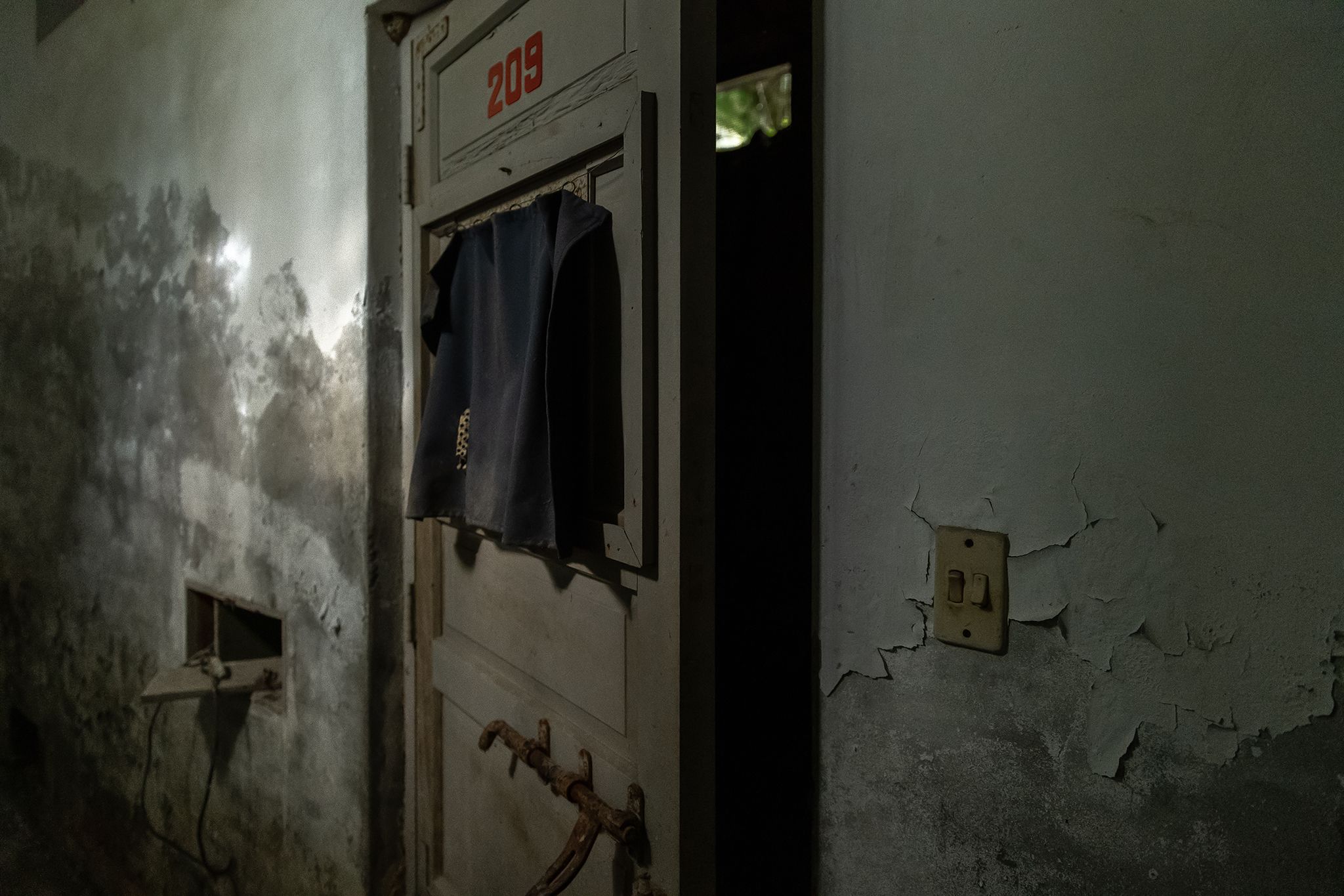 走过生鏽大门,进入接待室,内部的阴暗空间,与室外的阳光形成鲜明对比。空气中充满霉味,天花板沉重腐朽,不时飘下油漆木屑。
