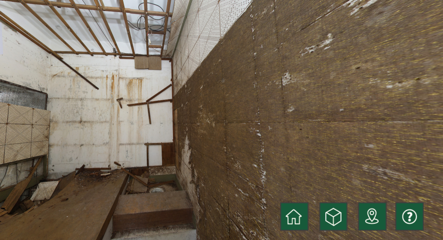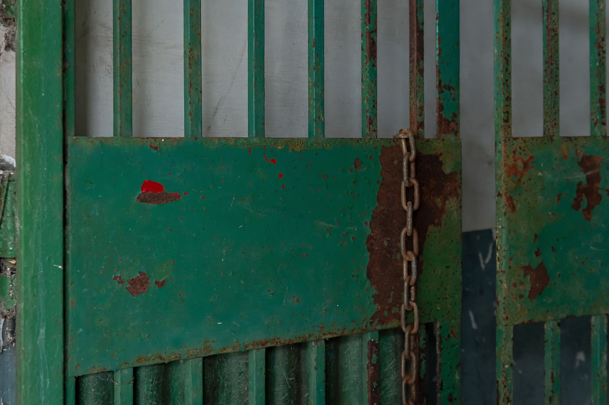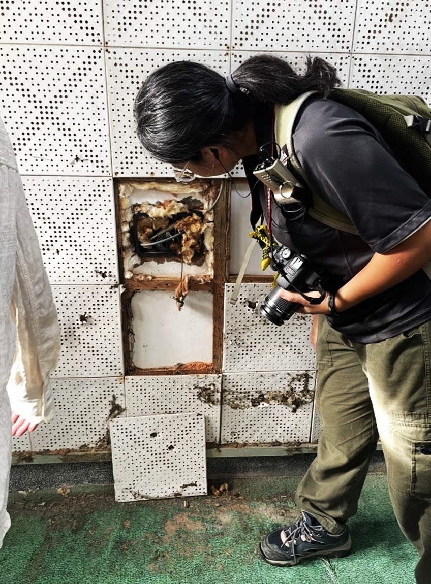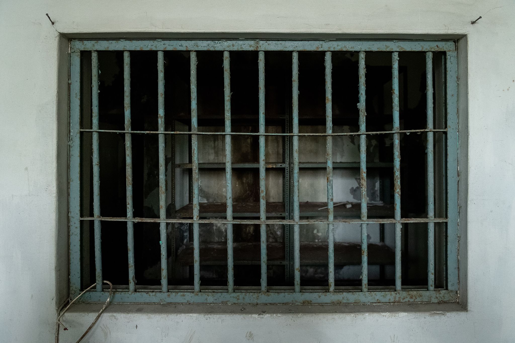 走过生鏽大门,进入接待室,内部的阴暗空间,与室外的阳光形成鲜明对比。空气中充满霉味,天花板沉重腐朽,不时飘下油漆木屑。