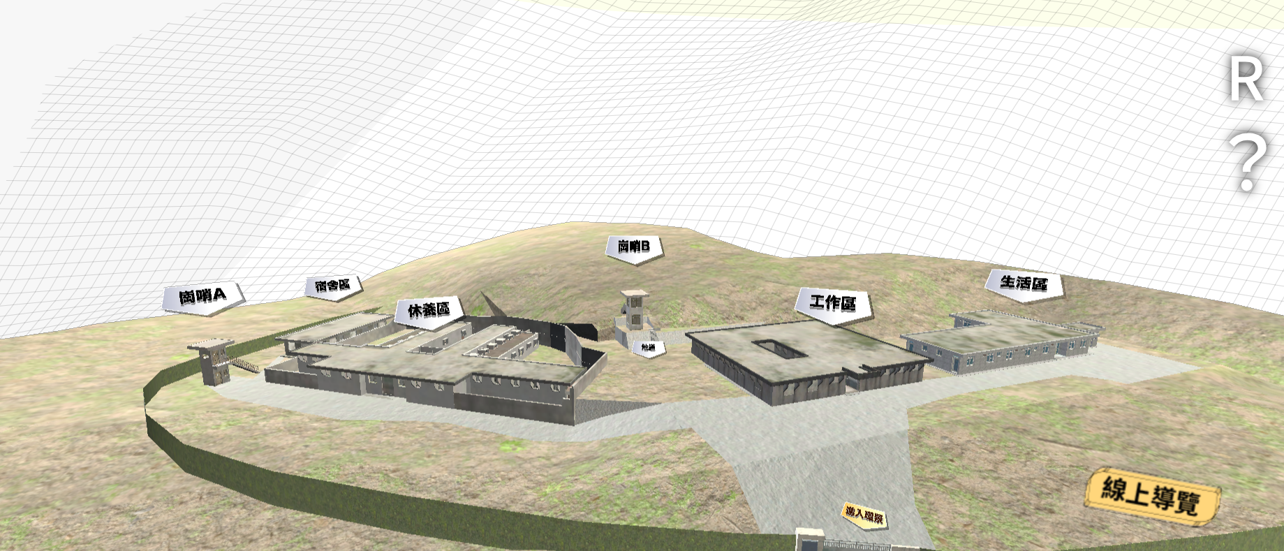 跟着导览走进铁门,里头是一系列的灰白建筑占地1,400坪(约4,628平方米),根据近期绘制的平面图推断,该建筑群包括“工作区”、“生活区”、“休养区”、“员工宿舍”、两座岗哨,以及后方判断应为靶场的室外空间。