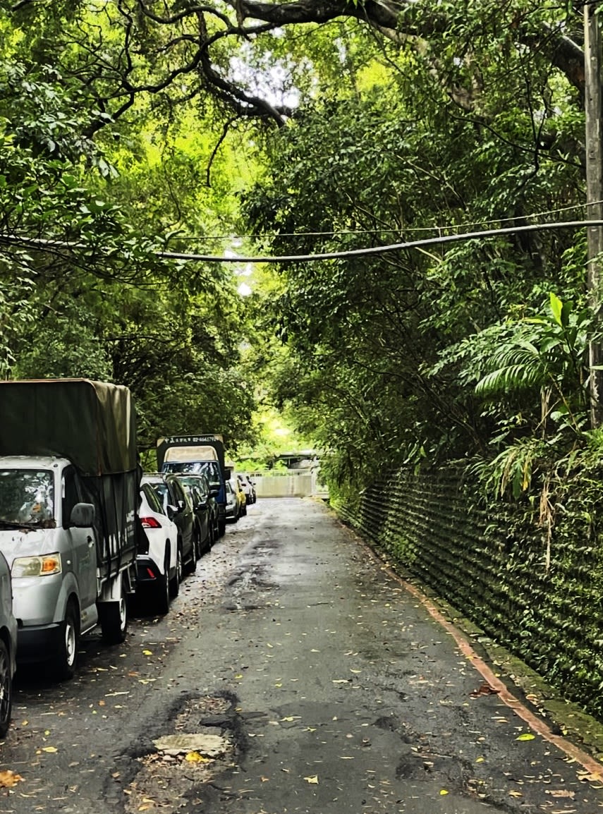 记者从台北车站搭捷运出发,约需花上90分钟抵达“玫瑰中国城”站。暗坑即河谷之意。走出车站后,必须沿着小路下坡、上坡、沿途经过一片竹林,周围杂草丛生,尽头有道铁门,可容纳大型车辆进出。不过大门深锁,又被树林遮盖视线,绿色与灰黑色的对比,带来凝重的生人勿近气氛。