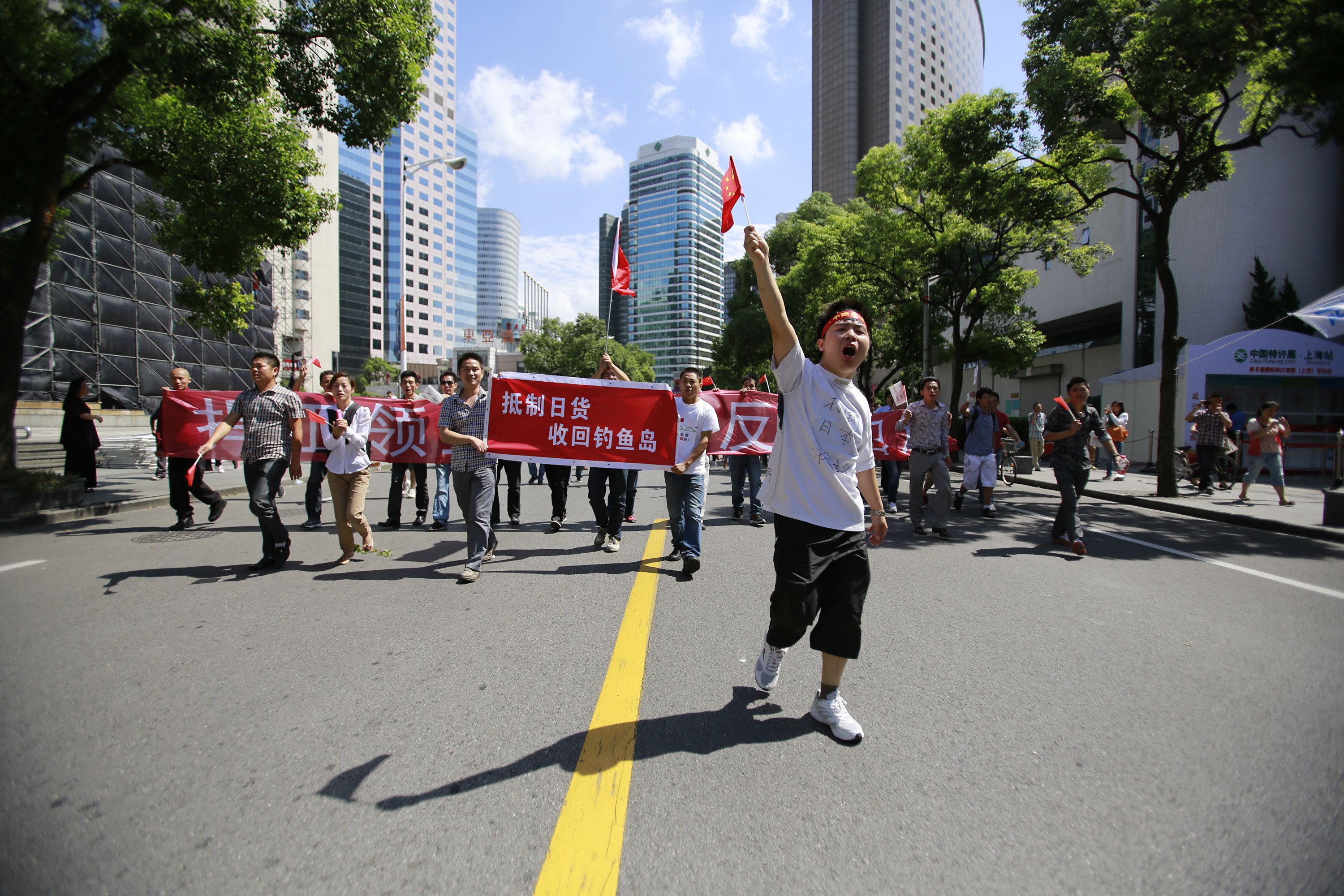 反日示威者在日本驻上海总领事馆附近游行。(AP Photo/Eugene Hoshiko)