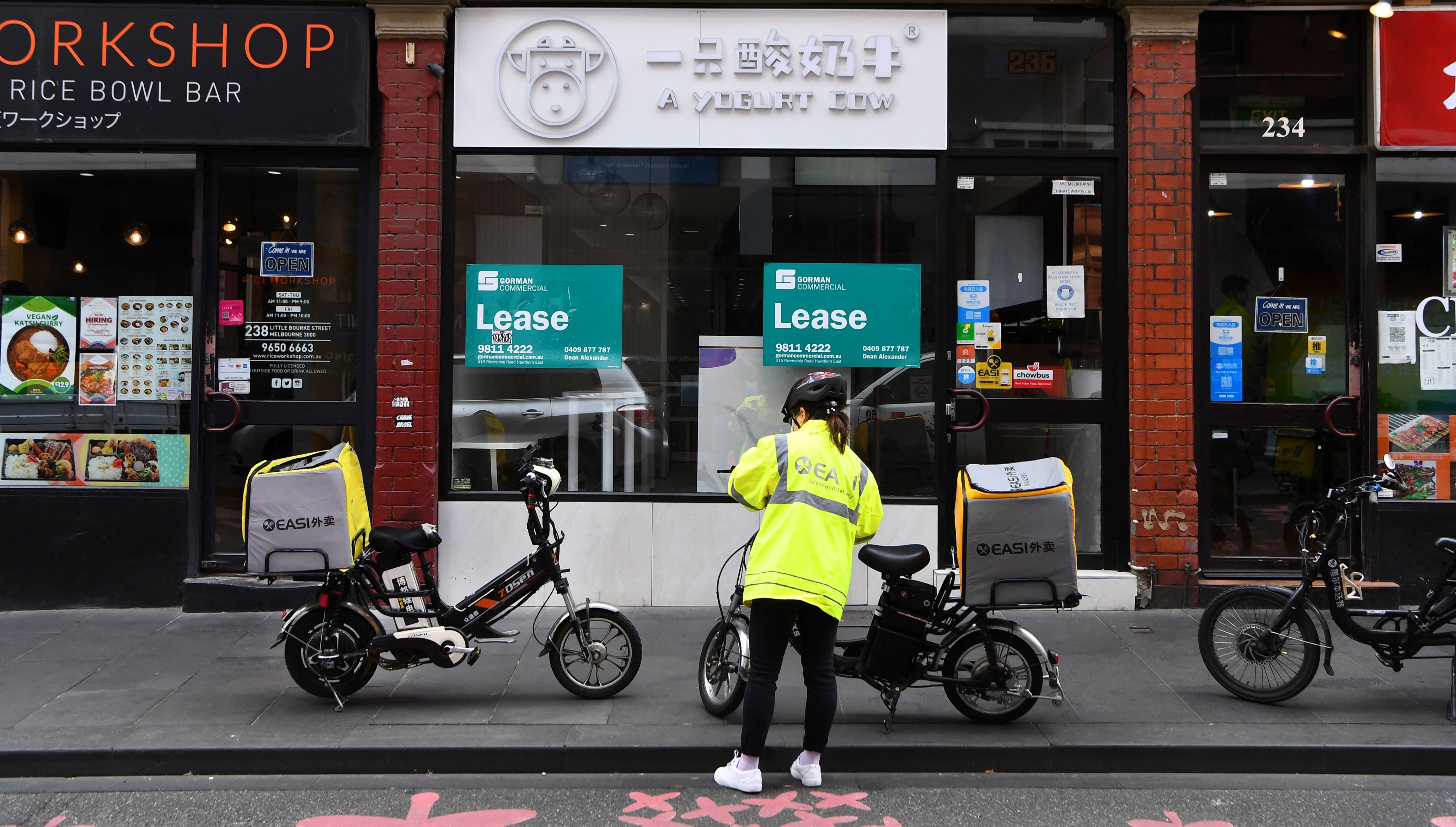 然而三月,澳洲进入封城状态,所有餐馆只能提供外送服务。尽管政府对受影响的企业提供了以雇员为单位的资金援助,鼓励企业不解雇员工,然而这些援助名额仅限于澳洲居民,对于依赖学生、背包客和临时签证持有者作劳动力的唐人街餐馆商店来说,这些援助始终有限。多家餐馆和商店被迫结束营业,门口贴着的店铺出租启事,在墨尔本封城的寒冬中额外孤零。