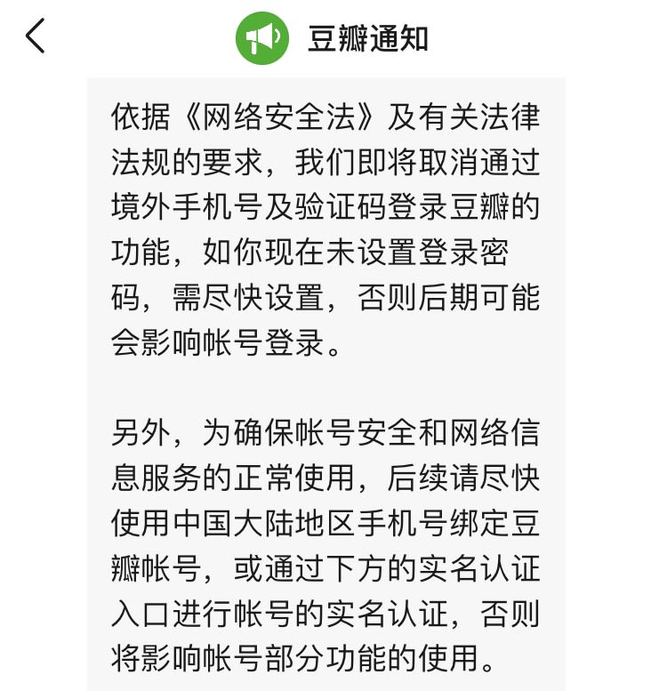 “依据《中华人民共和国网络安全法》及有关法律法规的要求,我们即将取消通过非中国大陆手机号接收验证码登录豆瓣的功能,如你现在未设置登录密码,需尽快设置,否则后期可能会影响帐号登录。 另外,为确保帐号安全和网络信息服务的正常使用,后续请尽快使用中国大陆地区手机号绑定豆瓣帐号,否则将影响帐号部分功能的使用。”豆瓣官方声称,新规定针对海外用户受影响,对中国境内用户却不受影响。豆瓣用户只要完成实名制认证后,所有发布动态、回覆、标记书影音功能都一切正常运作。