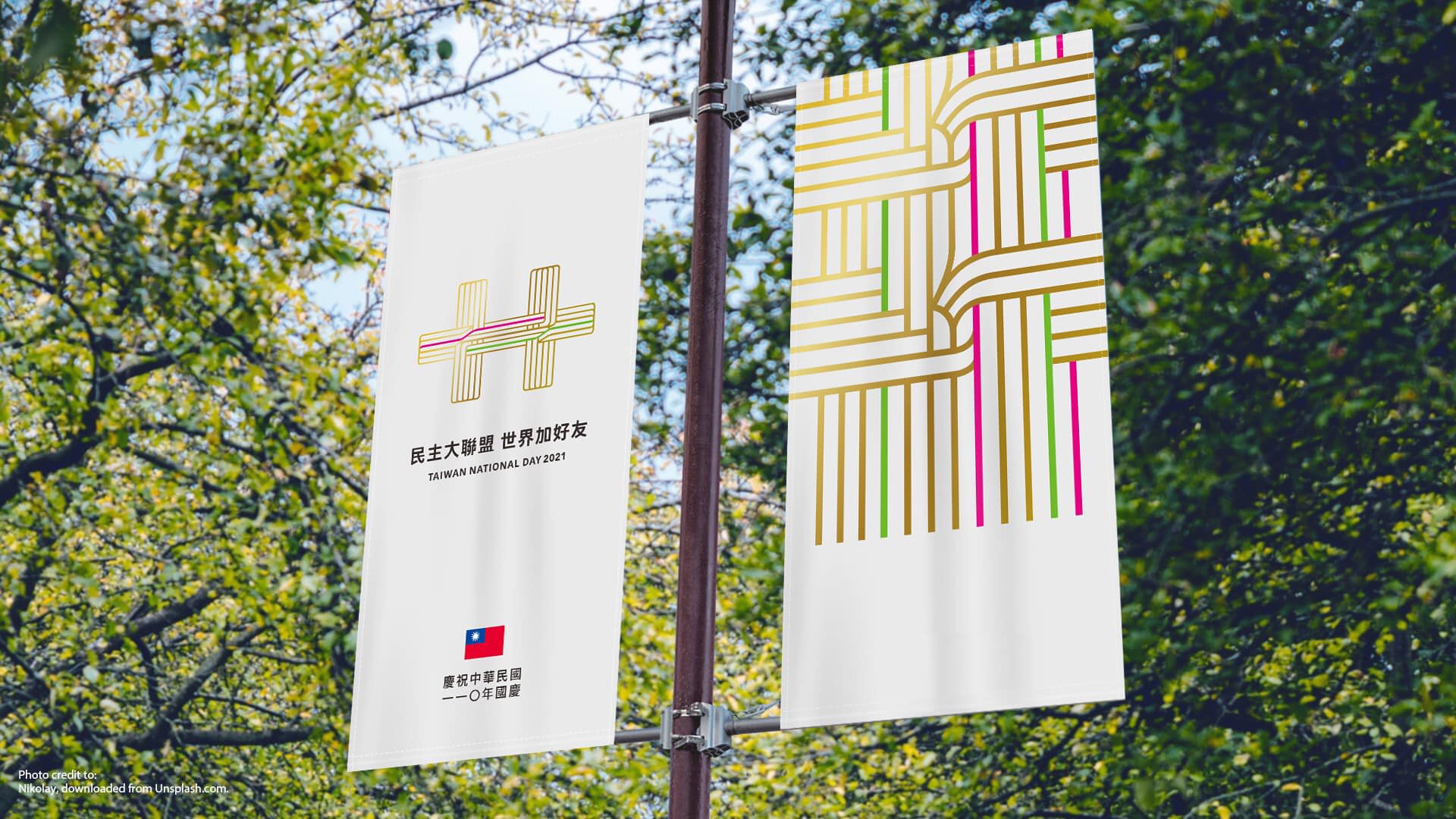 至于颜色和符号选用,“以前都是蓝白红国旗配色,我们其实也考虑过,”但若尝试以颜色象征政治光谱,台湾人民的政治选择,其实也就像从红、蓝、白到绿,加上编织的意象,“双十用交叉呈现,不同颜色编织起来,象征着团结,刚好颜色就是茄芷袋的颜色,很顺理成章。”