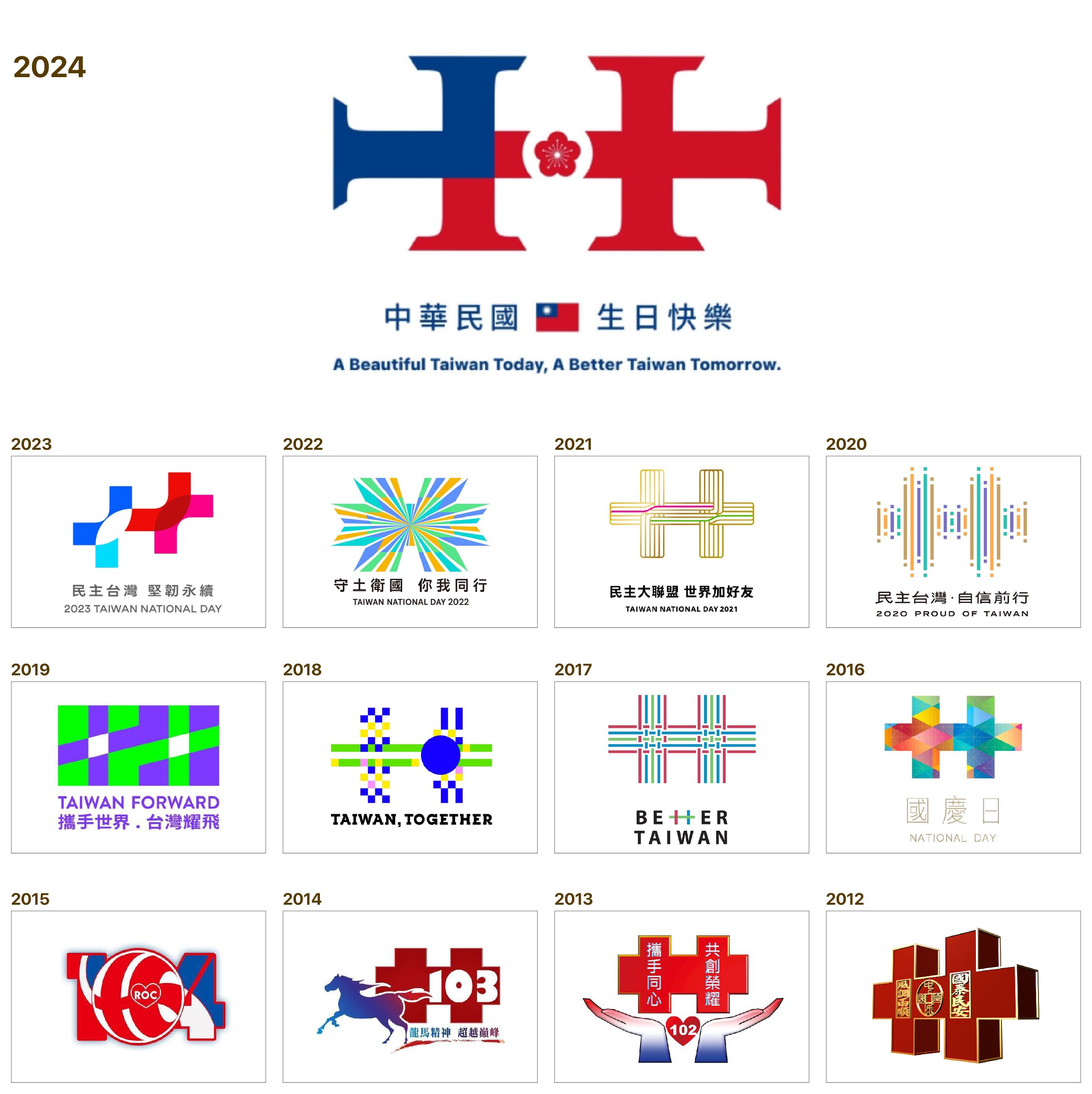 2012年2015年,马英九政府执政时期,清楚看见红蓝白元素,加上象征国庆的双十。不过这系列设计,往往被认为缺乏美感。媒体报导,2016年以前,立法院组织的庆筹会,多半委由军方处理,过往的国庆主视觉,有许多是军训教官们执行。该报导采访2016年后的国庆视觉创意统筹“帮推有限公司”负责人说法:“(2016以前的国庆主视觉)几乎都是教官们用小画家或是PowerPoint做出来的。”