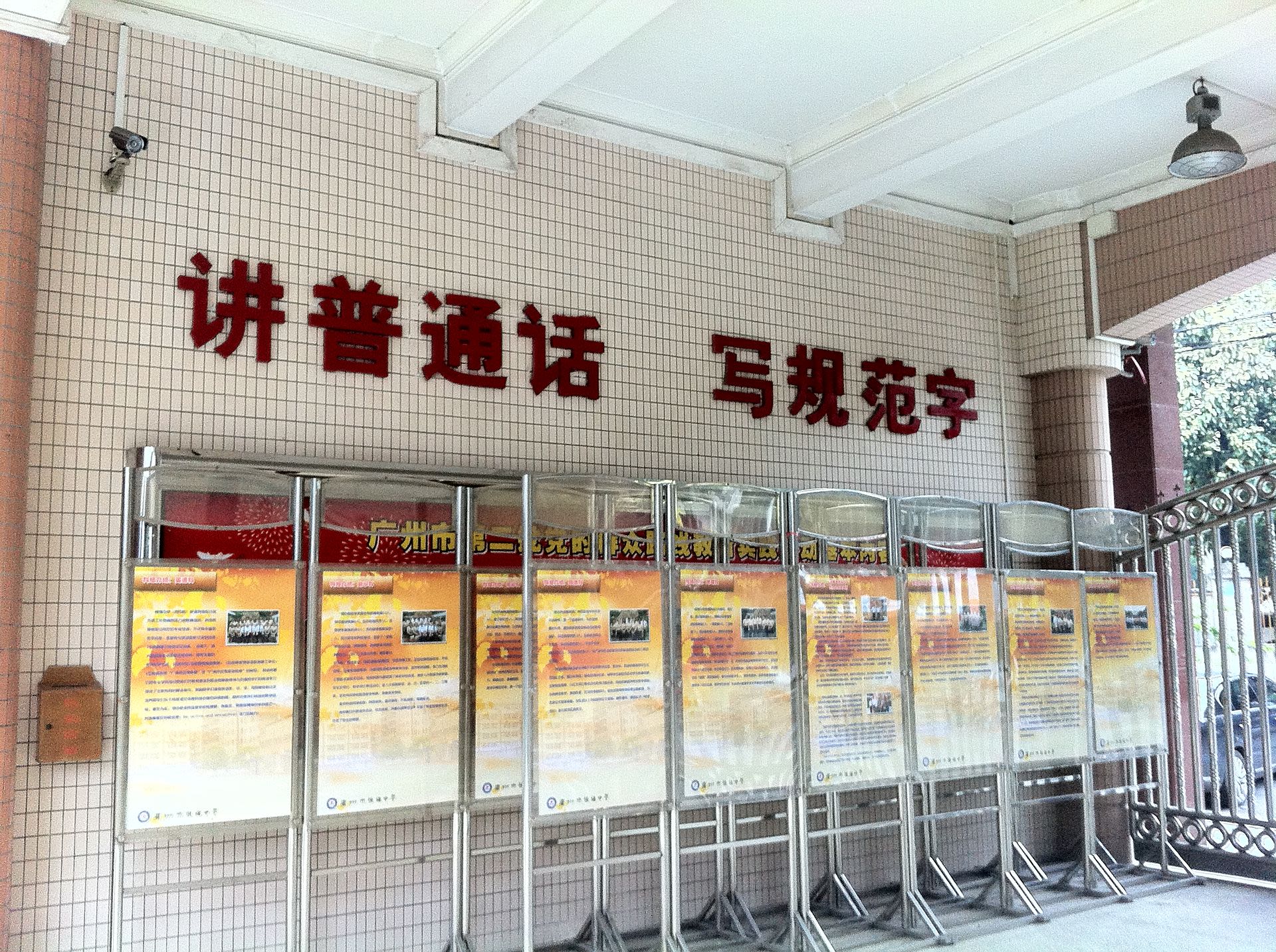 广州一间中学大门口上的宣传标语「讲普通话,写规范字」。 (网络图片)