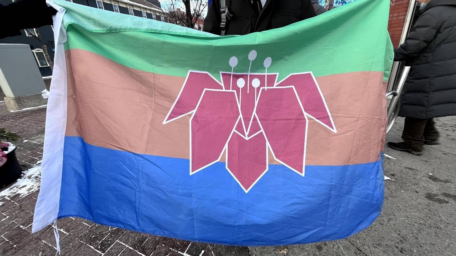 George 特地从广州老家带了一面代表广东的“木棉花旗”来到加拿大,并在去年底国际人权日集会上竖起,向世人展示他作为一名广东人身份。