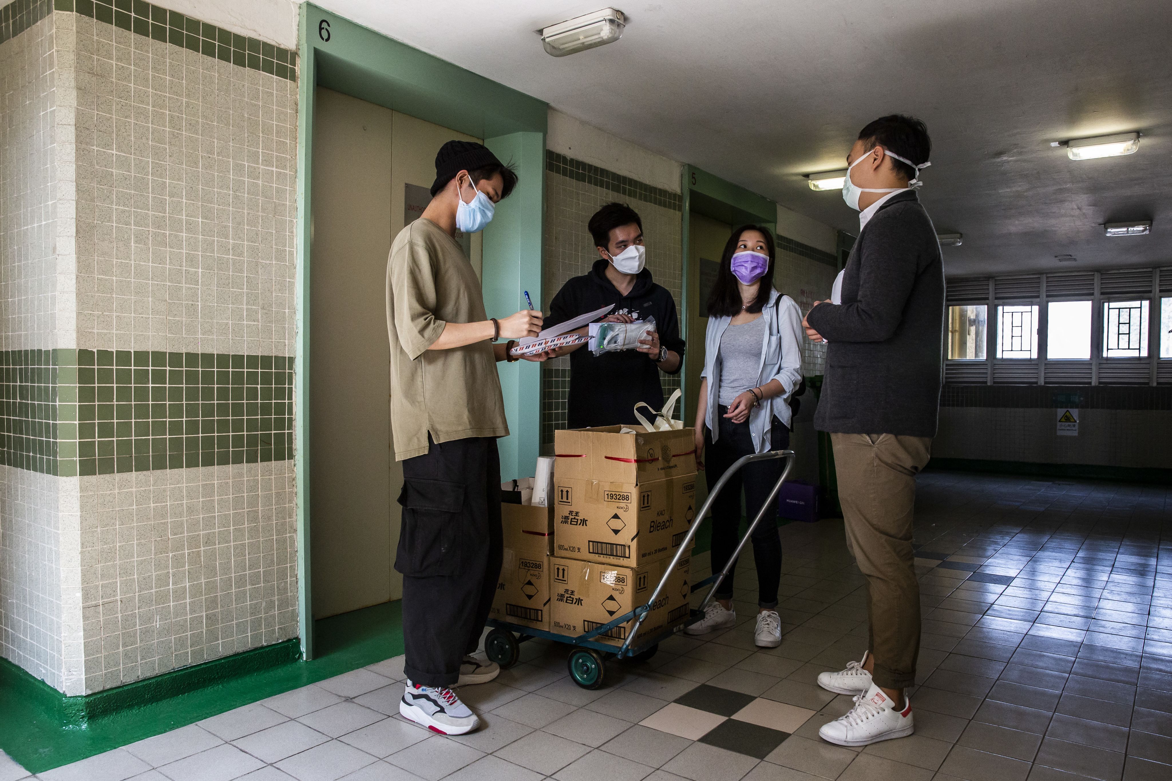 疫情期间,一名民主派议员和他的团队在香港一个屋邨分发口罩和消毒用品 (图片来源:法新社)