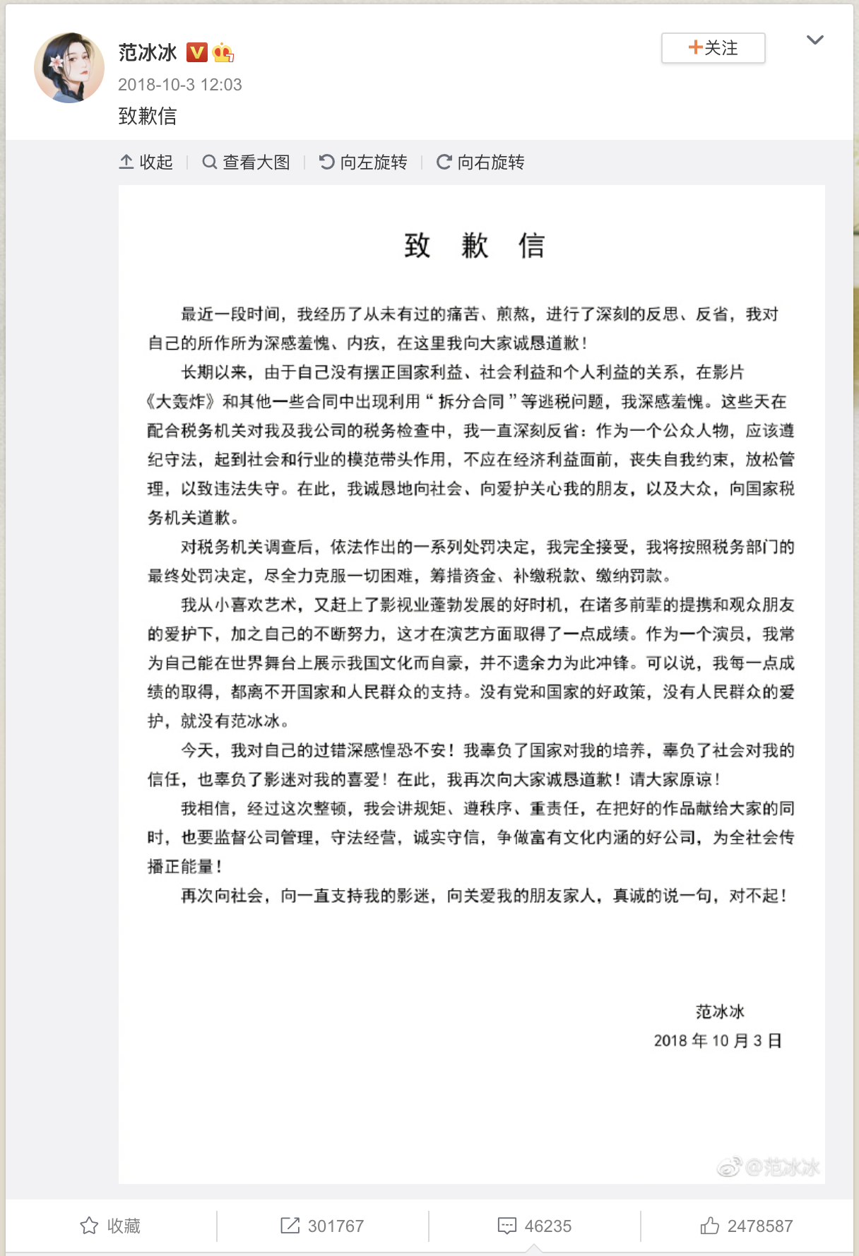 近年宣传部门强调名人在年轻观众中传播“正能量”,与祖国立场主动一致才不至砸饭碗。丑闻后,范冰冰仍在寻求出路,她微博介绍是“演员”及某“爱心公益项目发起人”。去年国庆,她加入明星的爱国转发大军,却被网友戏谑“逃税漏税就是你爱国的方式”。
