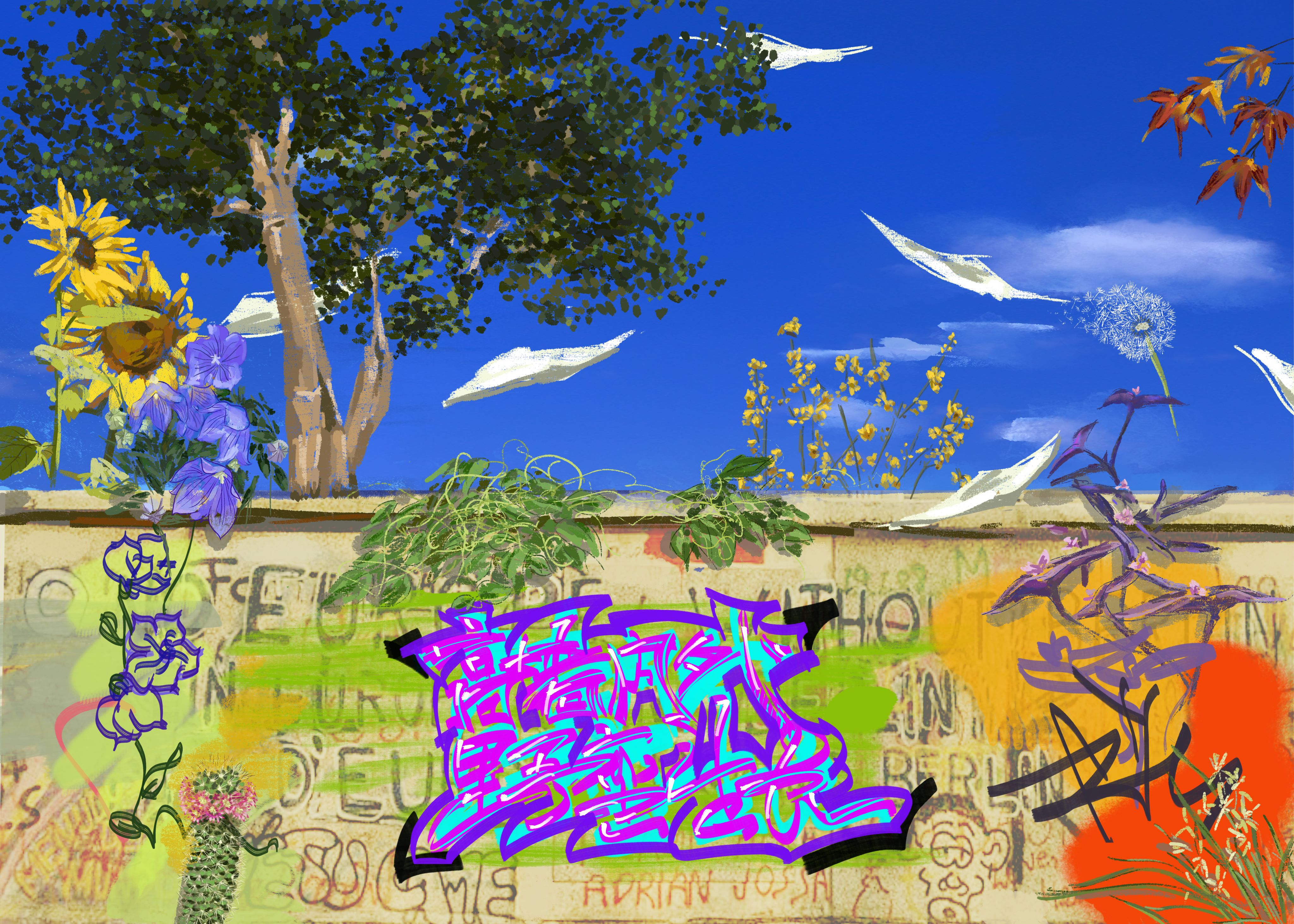 翻开杂志的第一页,印着一句大大的口号:“高墙内外,野蛮生长”。泡桐说,那个高墙是以柏林围墙为原型,而植物在当中慢慢去生长越过,“ 柏林墙本身象徵就是割裂、对自由的限制,我们做这本杂志就是想打破这种对母语写作的限制,大家可以恣意的生长、写作。”