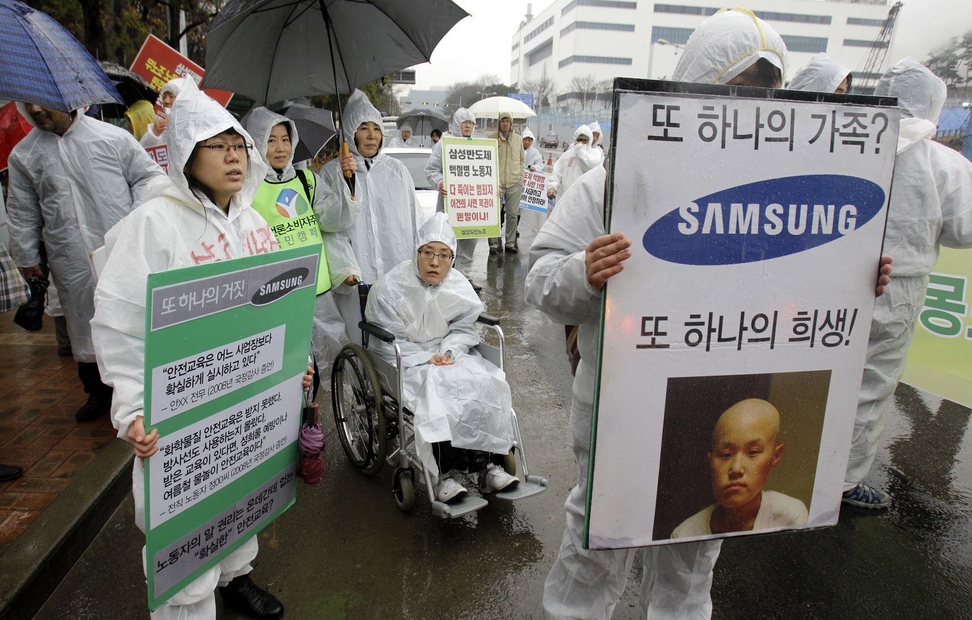 2010年3月25日,韩国活动人士在首尔南部的龙仁市集会游行,抗议三星电子试图压制因工作环境导致白血病的工人维权诉求。这个案件出现在韩剧《侦探医生》里。(AP Photo/ Lee Jin-man)