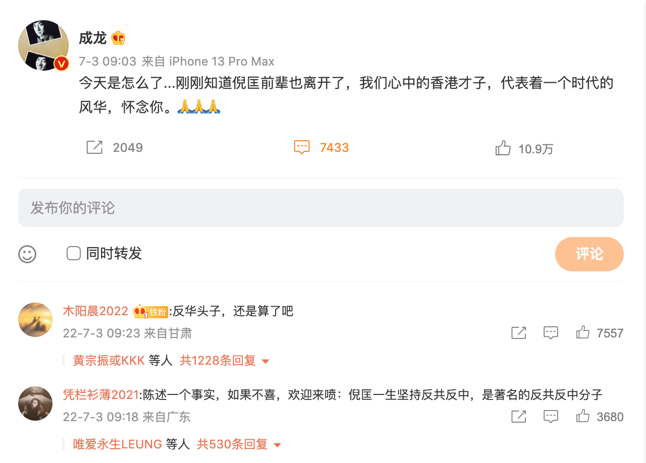 成龙于微博发文悼念倪匡,引发网民负评。 (新浪微博截图)