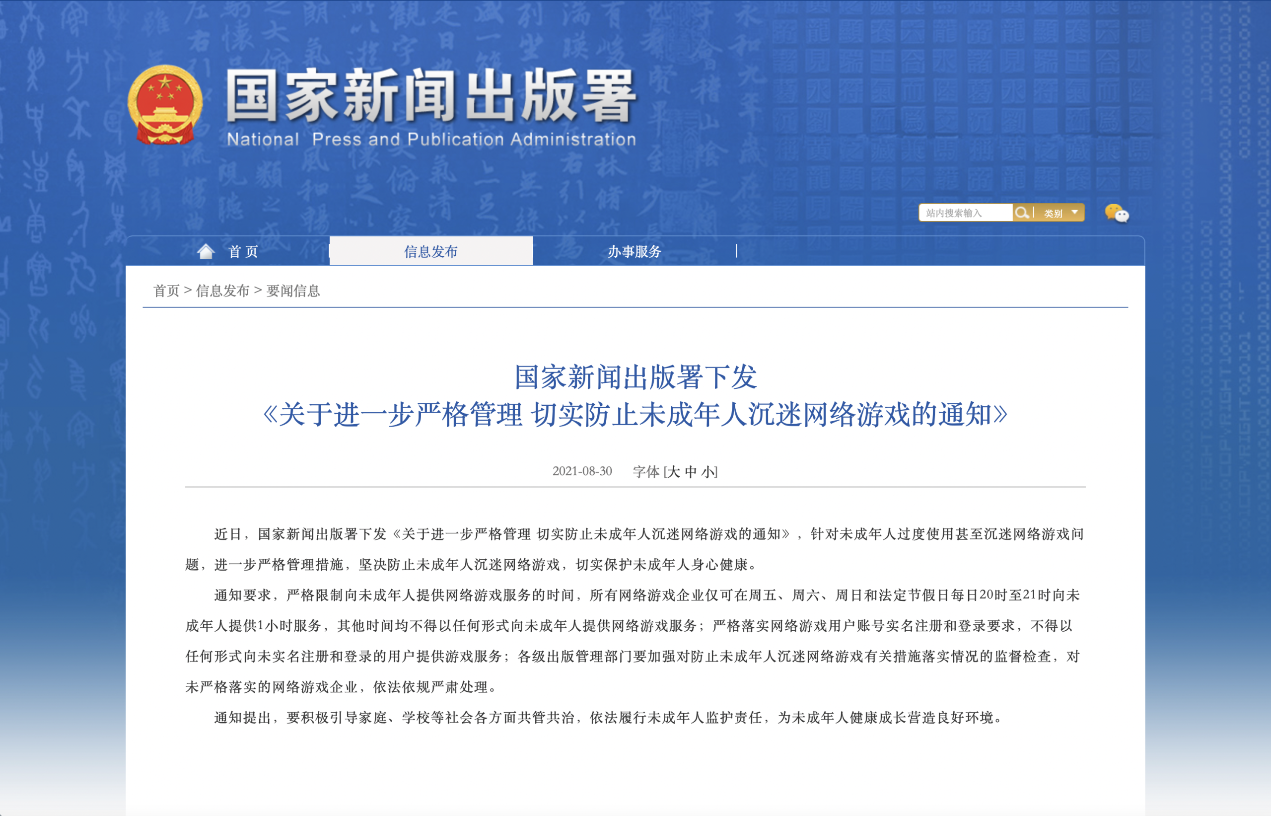 中国官方近日推出新政策,为防止青少年沉迷网络游戏,自9月1日起,限制所有网路游戏业者仅能在每周五、周六、周日,以及法定节日与假日的晚间8点至9点间,以1小时时间长度向未成年者开放使用游玩相关服务,其他时间均不可以任何形式提供未成年者使用网路游戏服务内容。该规定还将表示严格落实网路游戏使用者帐号实名注册与登录规定,不得以任何形式提供未完成实名注册与登录的使用者提供游戏服务,同时将要求各级出版管理部门严格监督检查,若网路游戏业者未严格落实相关规范,则将依照法规处分。