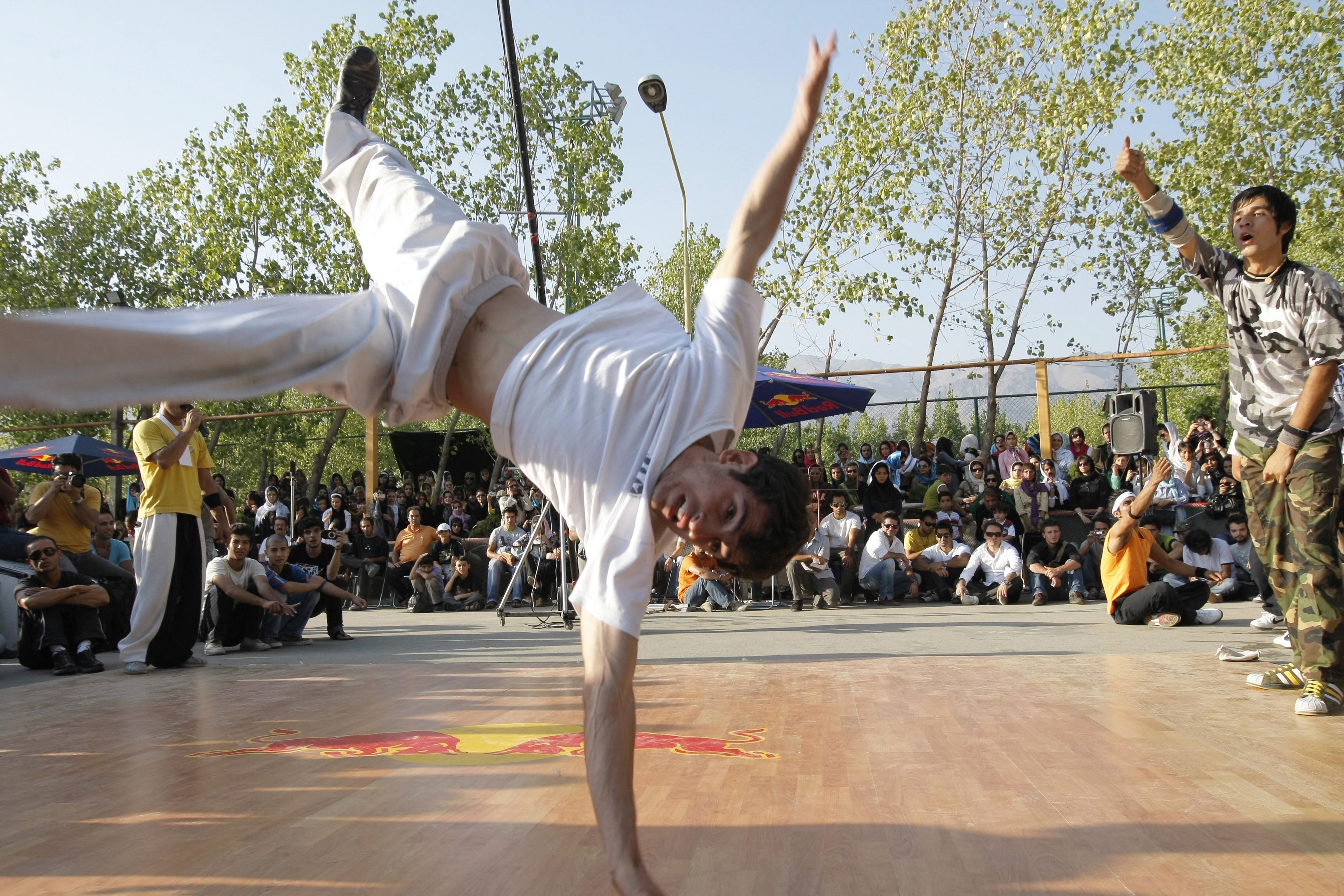 2008年7月30日,一名伊朗霹雳舞者在德黑兰举行的街头技能年度大赛上展示自己的舞姿。该大赛是第三届西式街头技能年度大赛,比赛项目包括涂鸦艺术、滑冰、小轮车特技和霹雳舞。(AFP / BEHROUZ MEHRI)