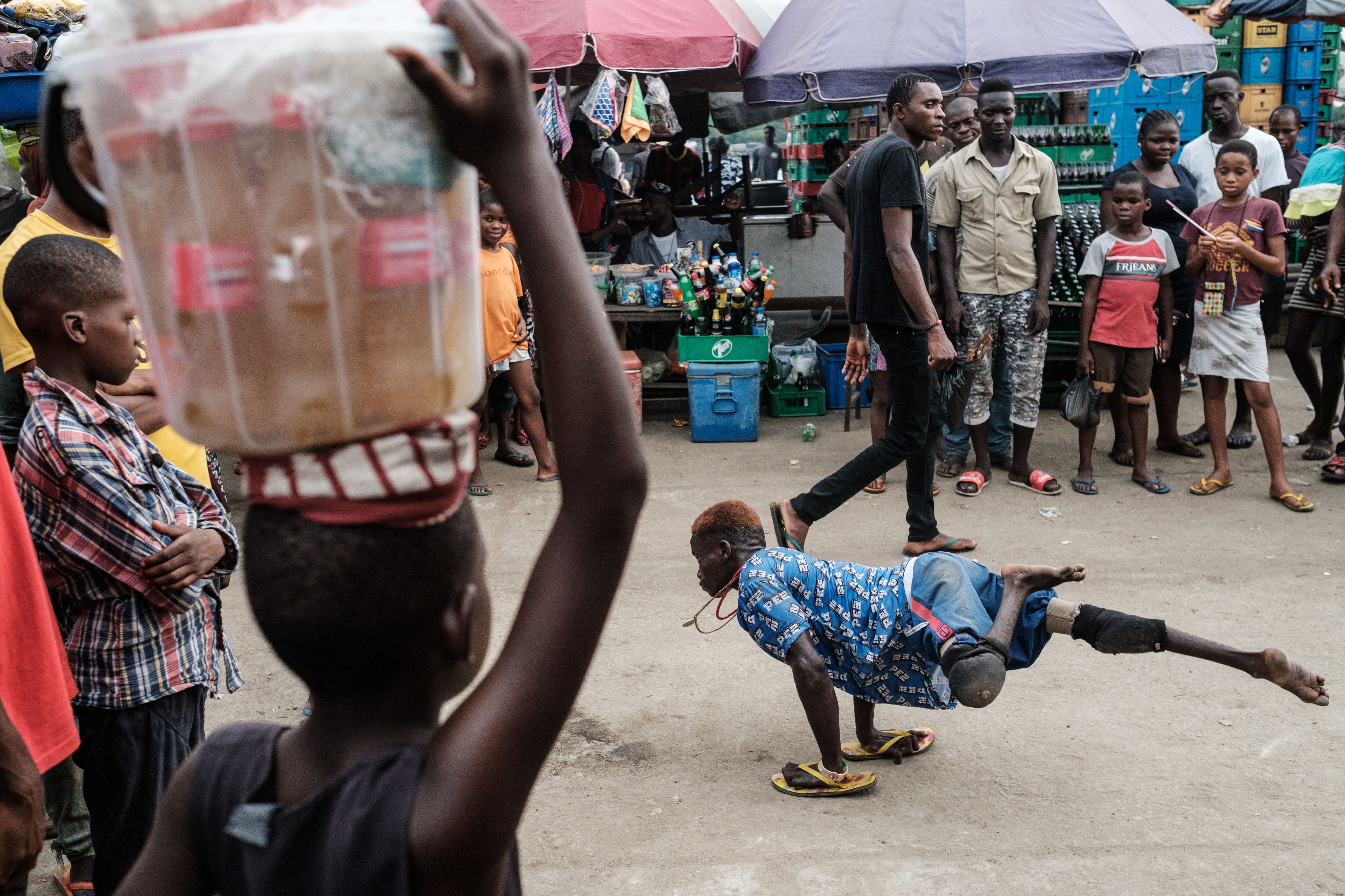 2019年2月27日,18岁的尼日利亚残疾少年Kevin在尼日利亚南部哈科特港的海滨表演霹雳舞。(AFP / Yasuyoshi CHIBA)