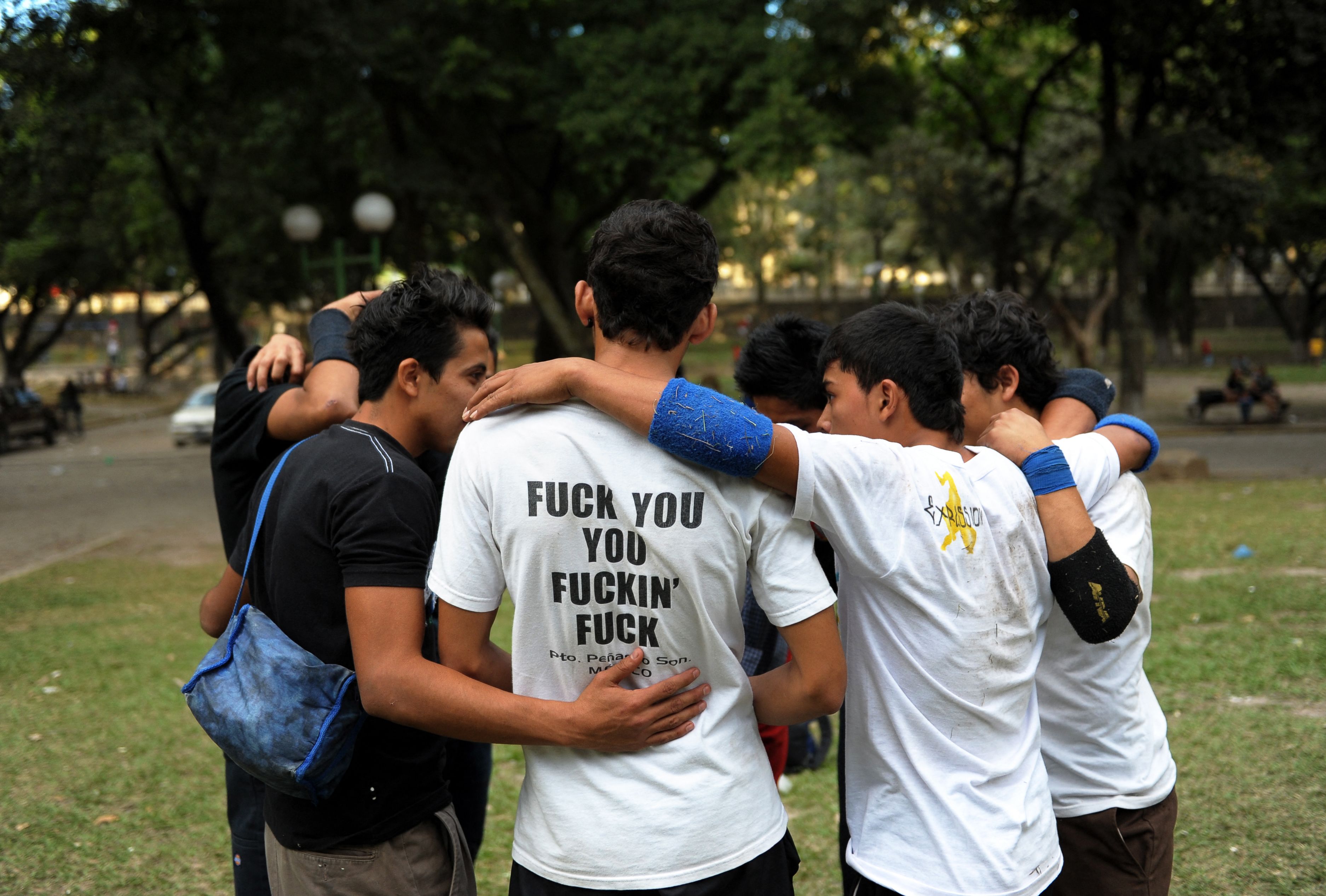 2012年2月12日,Arces舞团成员在萨尔瓦多圣萨尔瓦多的库斯卡特兰公园表演前祈祷。Expresion Urbana 是一个青年组织,致力于推广霹雳舞等城市文化,让萨尔瓦多的年轻人远离暴力和帮派。(AFP PHOTO/Jose CABEZAS)