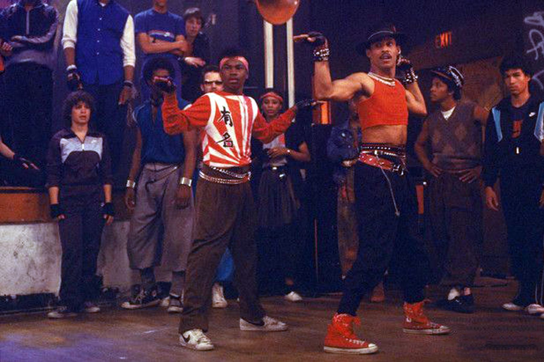 电影《霹雳舞》(breakin’)中穿着时尚的舞者(《霹雳舞》截图)。《霹雳舞》电影出品于 1984 年,中国则在1987年引进,并掀起了中国年轻人中的霹雳舞热潮。