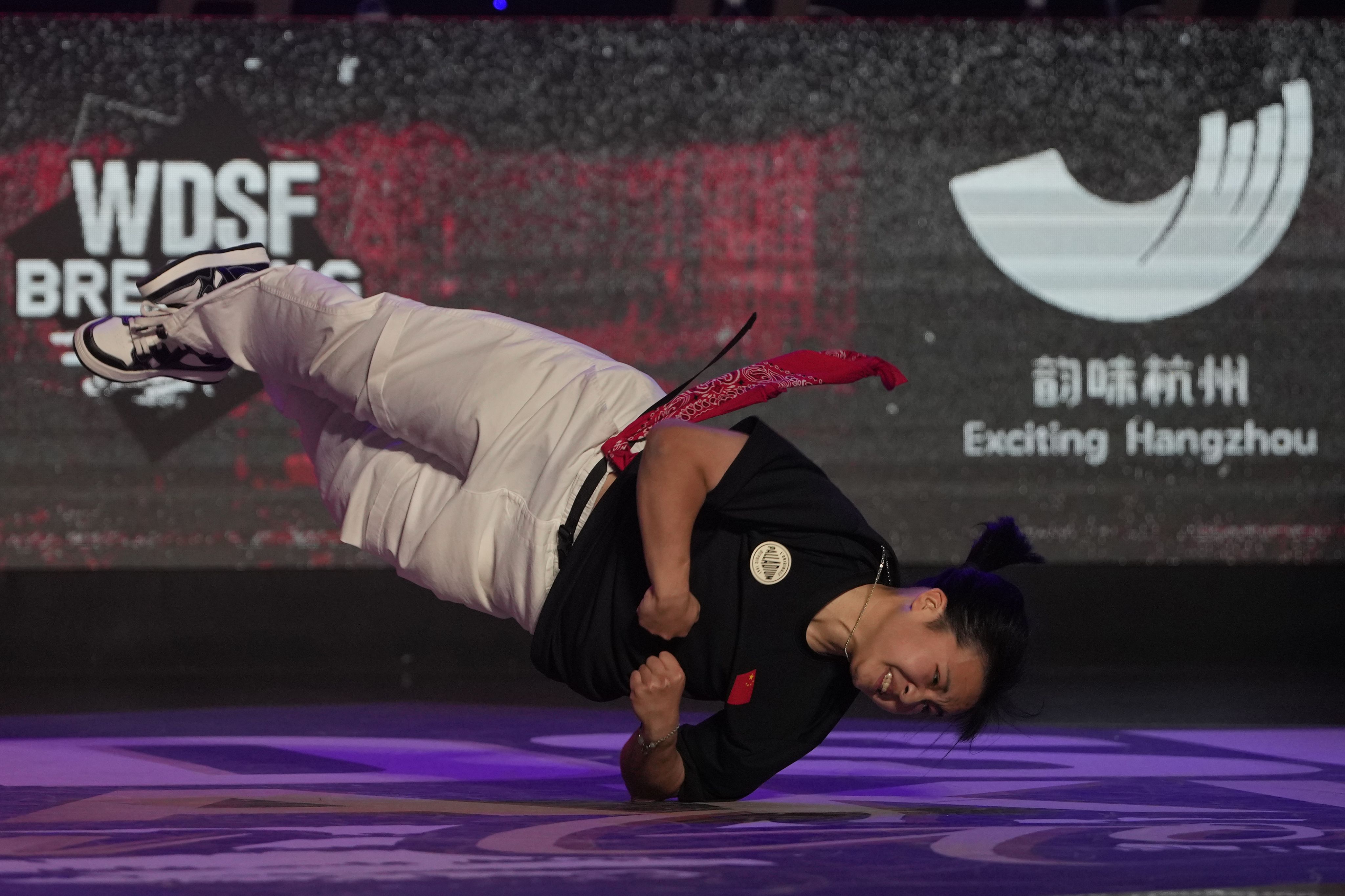 2023年7月2日,在浙江省杭州市举行的 2023 年 WDSF 亚洲街舞锦标赛上,中国“671队”队员参加霹雳舞1vs1 b-girl 比赛。 (AP /Ng Han Guan)