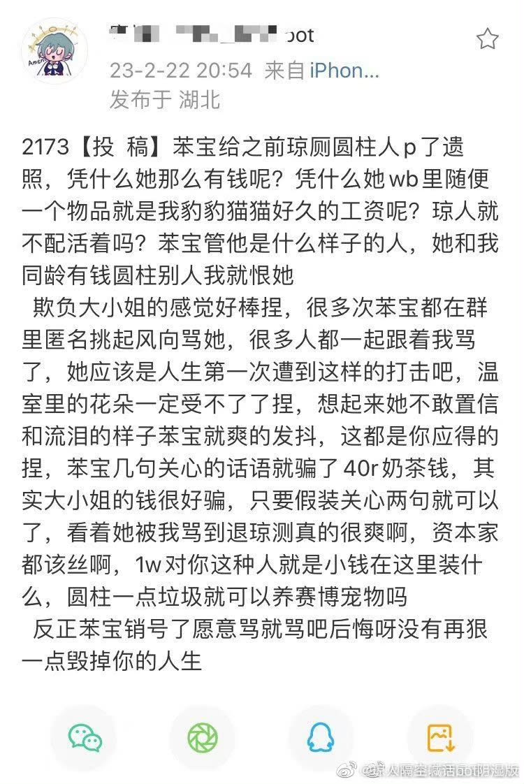 “苯宝给之前琼厕圆柱人p了遗照,凭什么她那么有钱呢?凭什么她wb里随便一个物品就是我豹豹猫猫好久的工资呢?琼人就不配活着吗?苯宝管她是什么样子的人,她和我同龄,有钱援助别人我就恨她。”