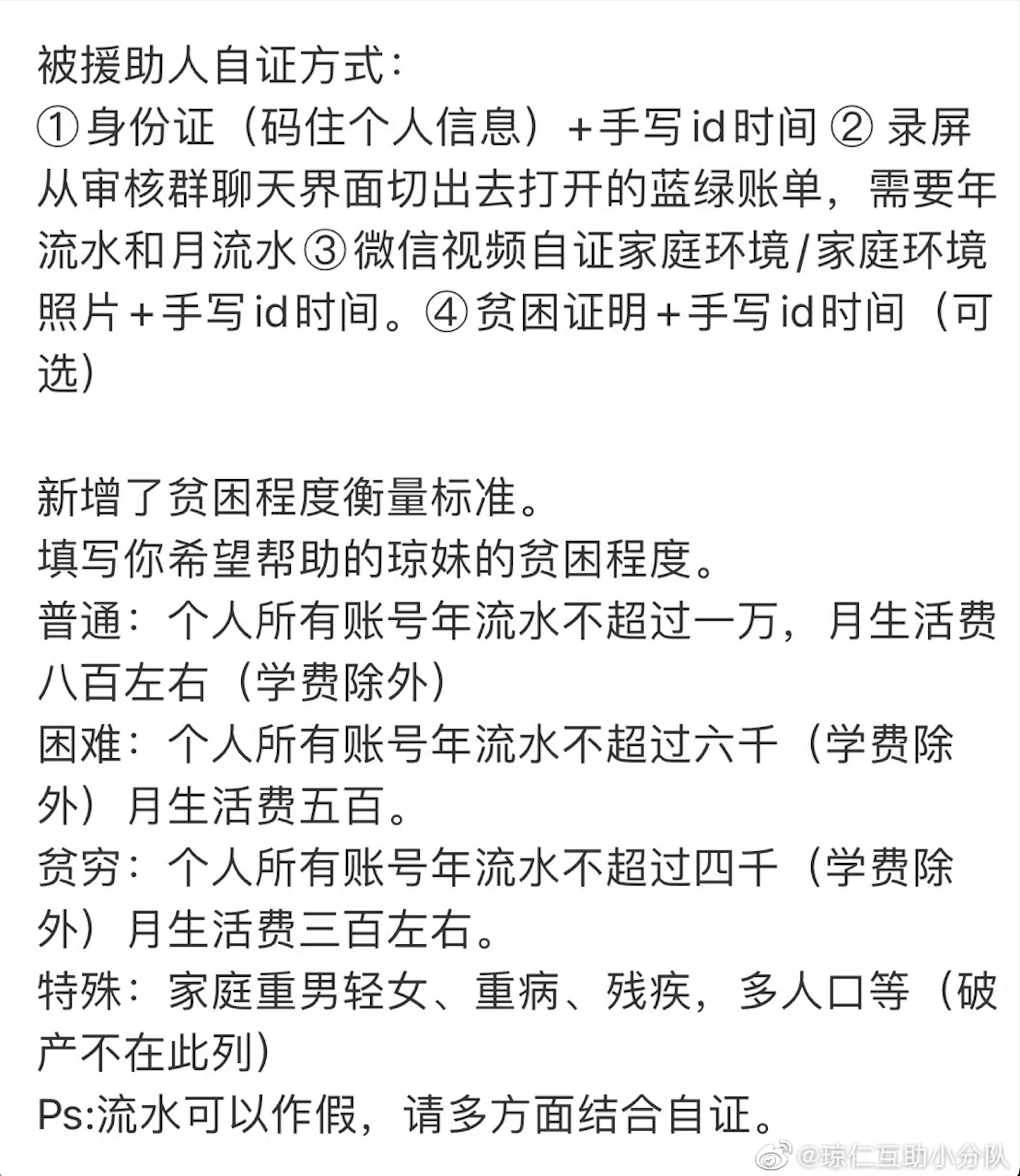 贫困很难划分出一个标准,因此交给援助人自己判断。她们分别建立了援助人和被援助厕妹的qq群,自愿充当起客服的角色,在审核通过后为两方提供对接。厕妹需要就经济状况提交很多项自证,包括微信和支付宝的流水、视频拍摄家庭环境等等。