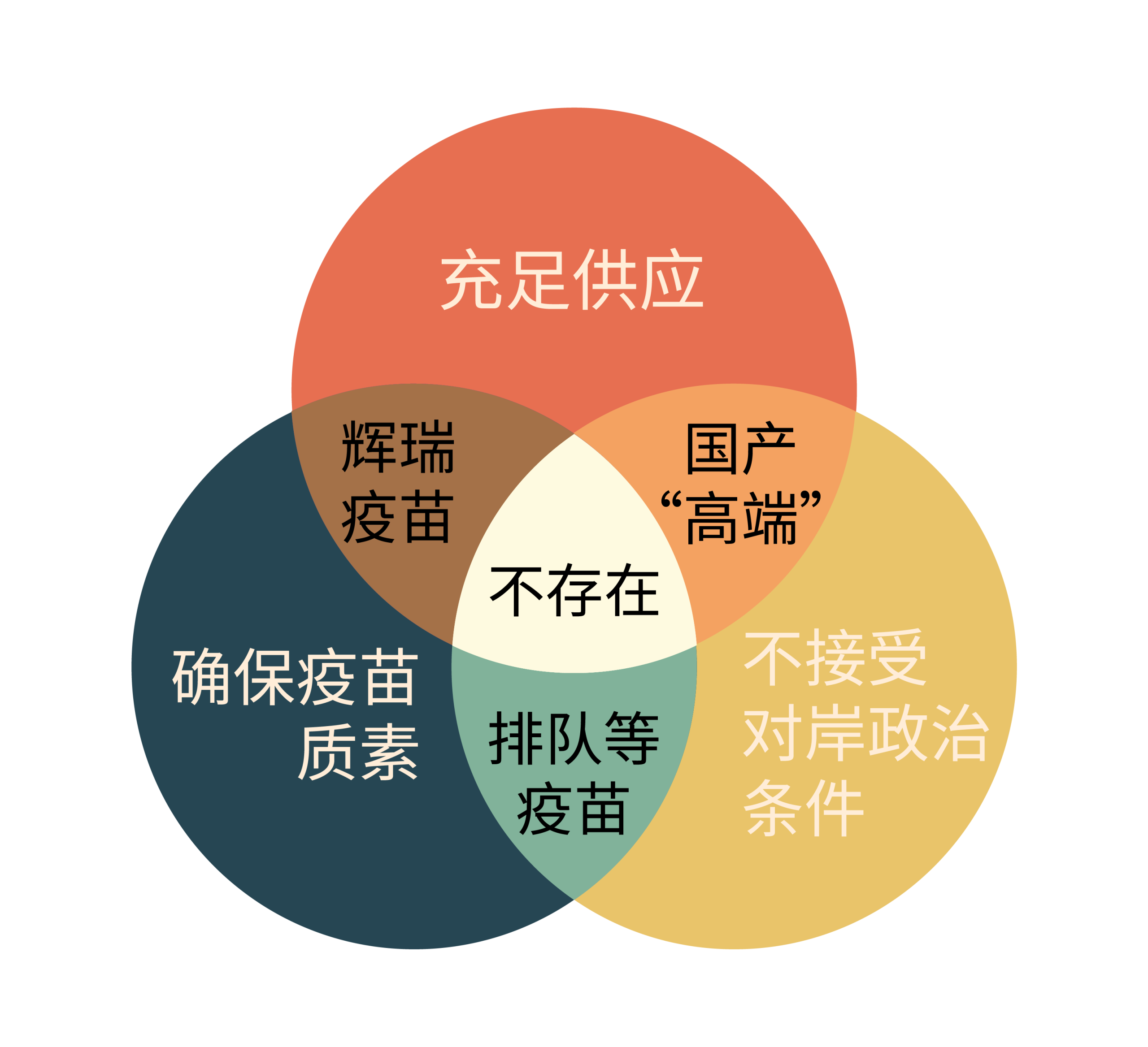 台湾疫苗供应之所以不断成为靶子,是因为面对“不可能三角”:无法同时满足“充足供应”、“确保疫苗质素”、“不接受对岸政治条件”三个条件。