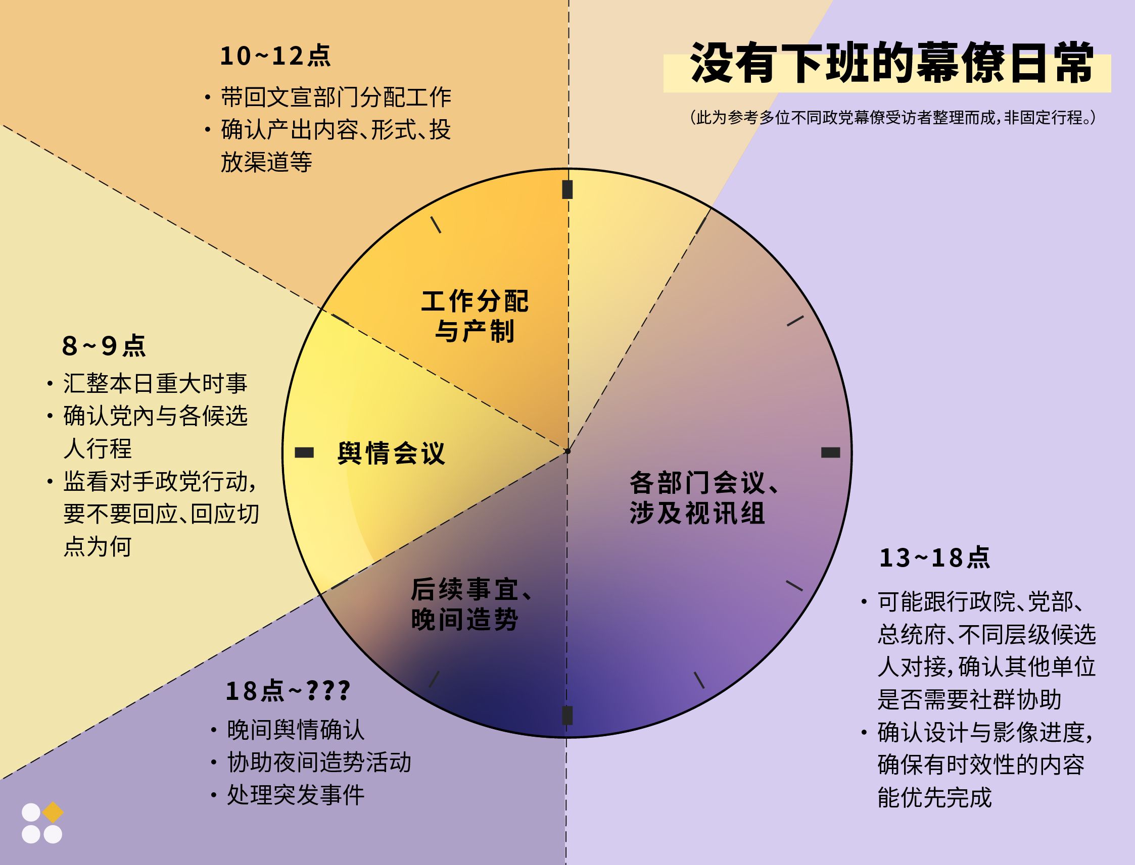 “理论上九点上班,六点下班,但选前我们几乎没有下班时间,因为到晚上也有活动或造势,那就要做直播,群组也要回应各种讯息。”Sidney说,“在我们部门有句话,叫‘你只要没有插管(急救),都要起来回讯息。’”