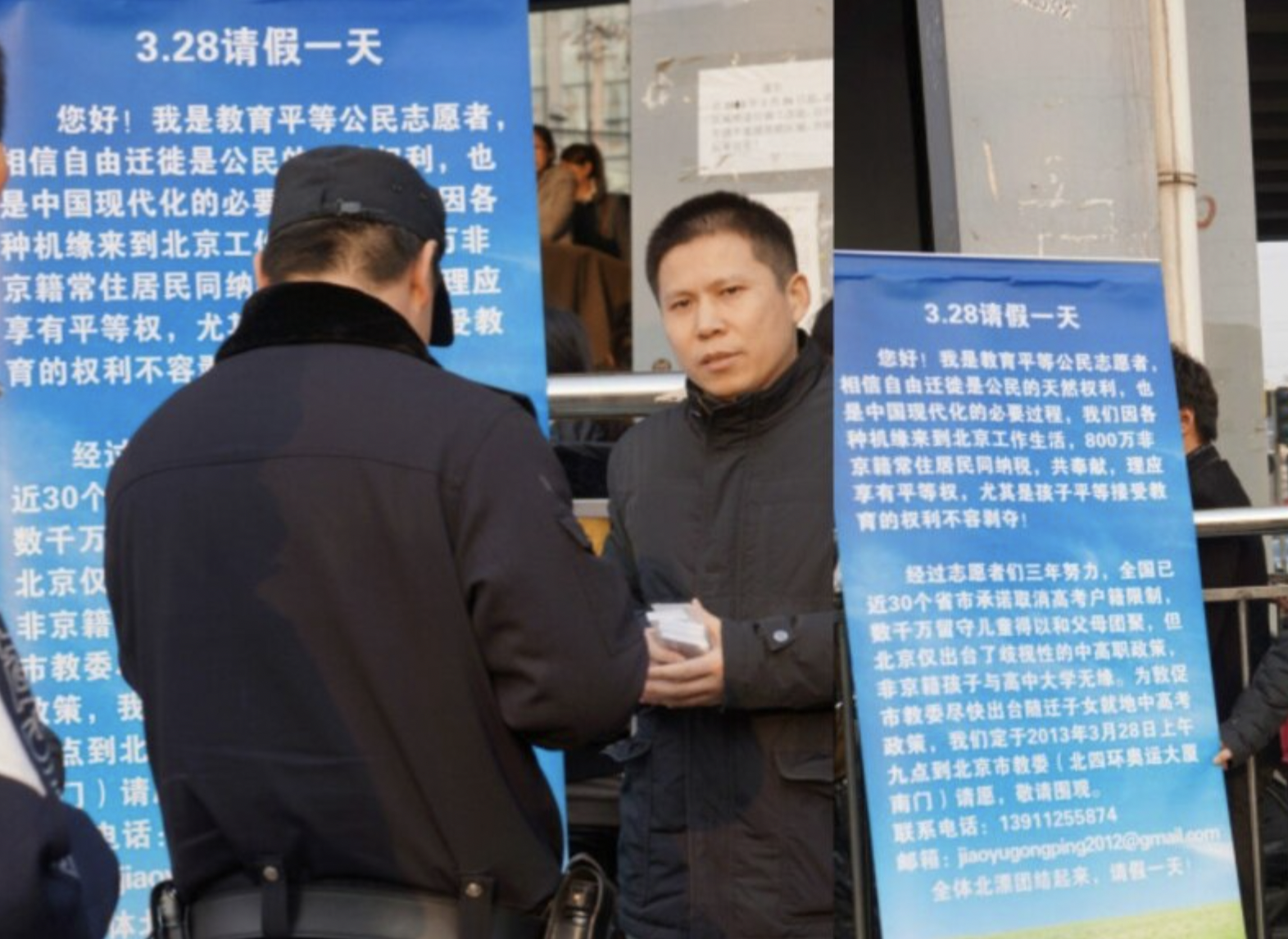 中国公民权利活动人士许志永宣传教育平等遭警察盘问。(网络截图)