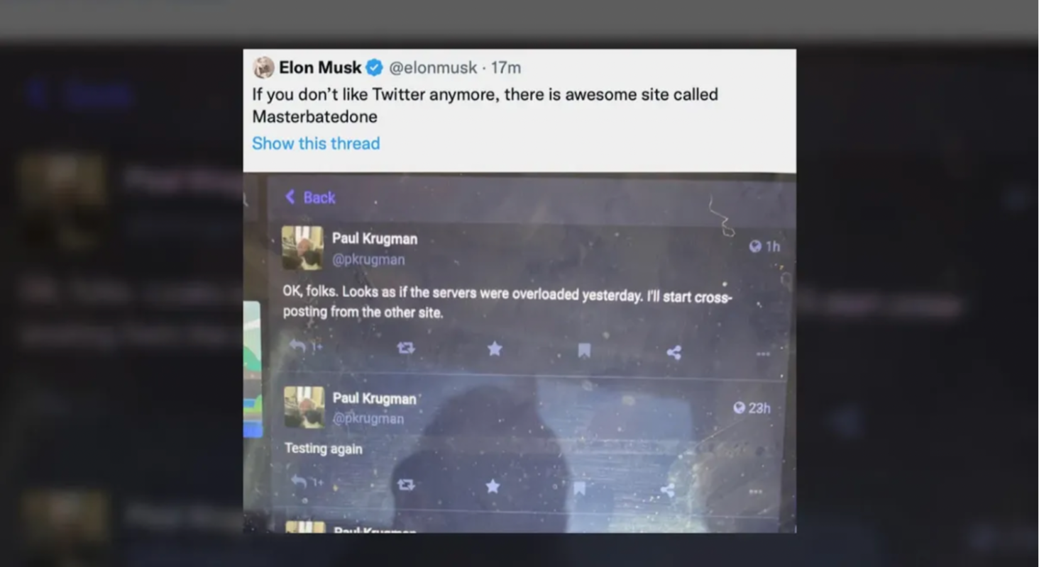 2022年11月7日,特斯拉CEO,巨富马斯克在Twitter上发出了一条颇为没品的推文:"If you don't like Twitter anymore, there is awesome site called Masterbatedone." (你要是不喜欢推特了,这里有个叫做Masterbatedone的好网站)。这是一个指桑骂槐的谐音梗,Masterbatedone直译过来就是手淫完毕,而实际上,他是在暗讽自己的商业对手网站Mastodon,中文名叫“长毛象”。