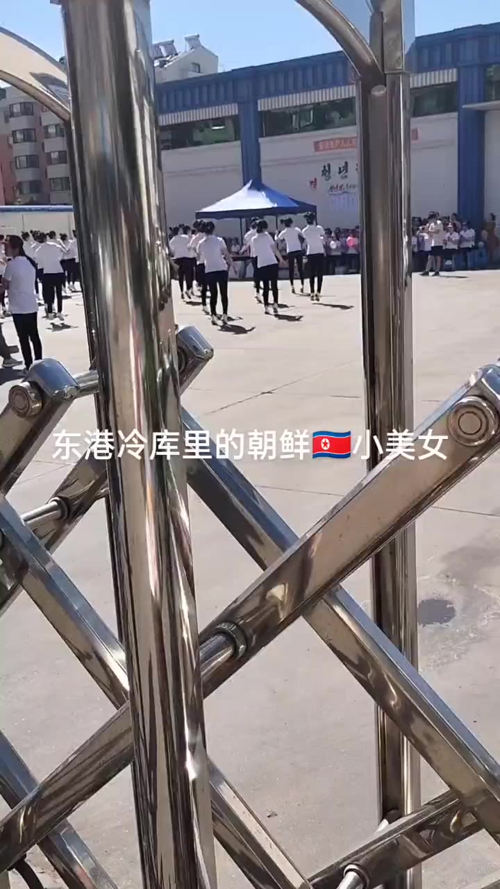 朝鲜工人有时会出现在中国的海鲜加工厂,因为有些活动是在厂区的户外举行的。在这个视频中,女性们在丹东远亿精制海鲜有限公司前的一面纪念“青年节”(一个朝鲜节日)的壁画前,表演了一场同步舞蹈。屏幕上的中文写着:“来自朝鲜的美丽小姑娘在东港的冷库里。”(抖音 / The Outlaw Ocean Project)