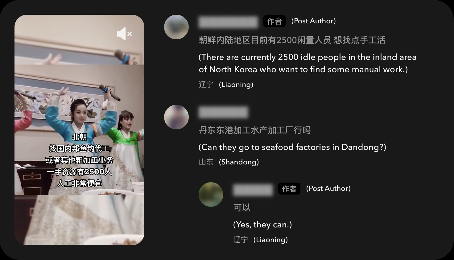 为了安排工人到中国的海产品公司,朝鲜渔业部与中国人力资源和社会保障部进行协调(这些机构未回应置评请求)。物流通常由中国私人“派遣”公司处理,有时就业安置还会在网上进行。例如,2023年9月抖音上的一段视频中,上传者宣布有2500名朝鲜工人“希望找到体力工作”。一位评论者询问是否可将他们派往丹东的海鲜工厂,发布者同意了。另一则近期帖子宣传称可以供应5000名朝鲜工人,并收到21条回复。