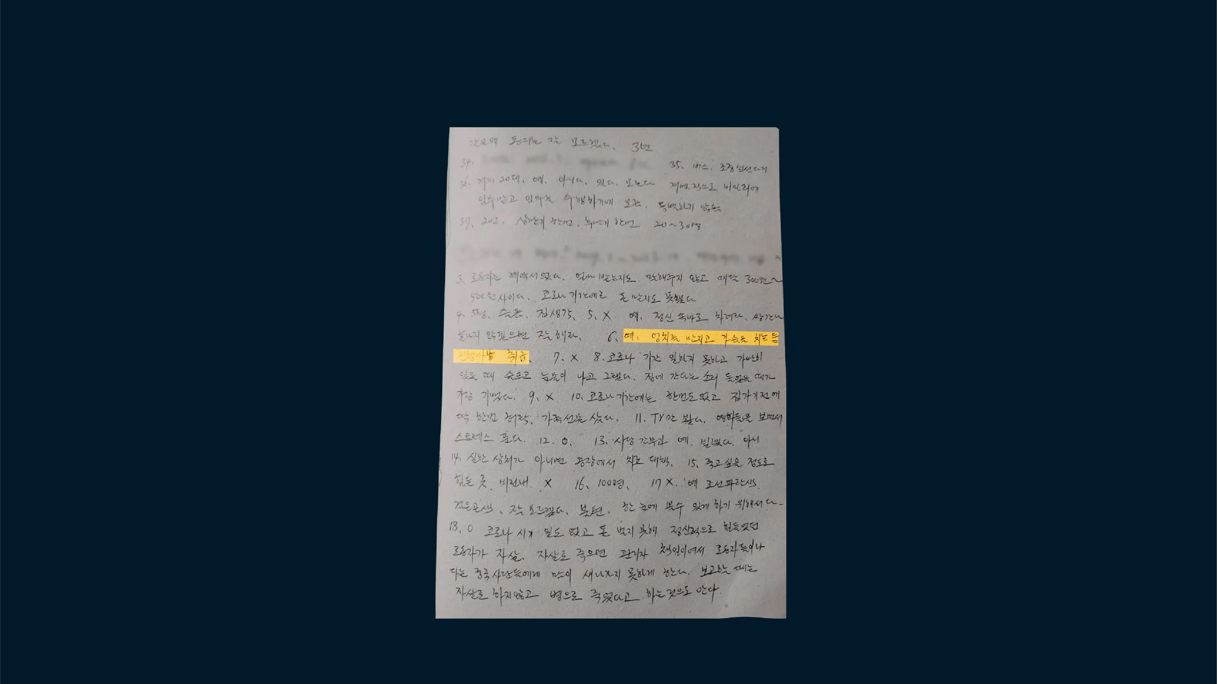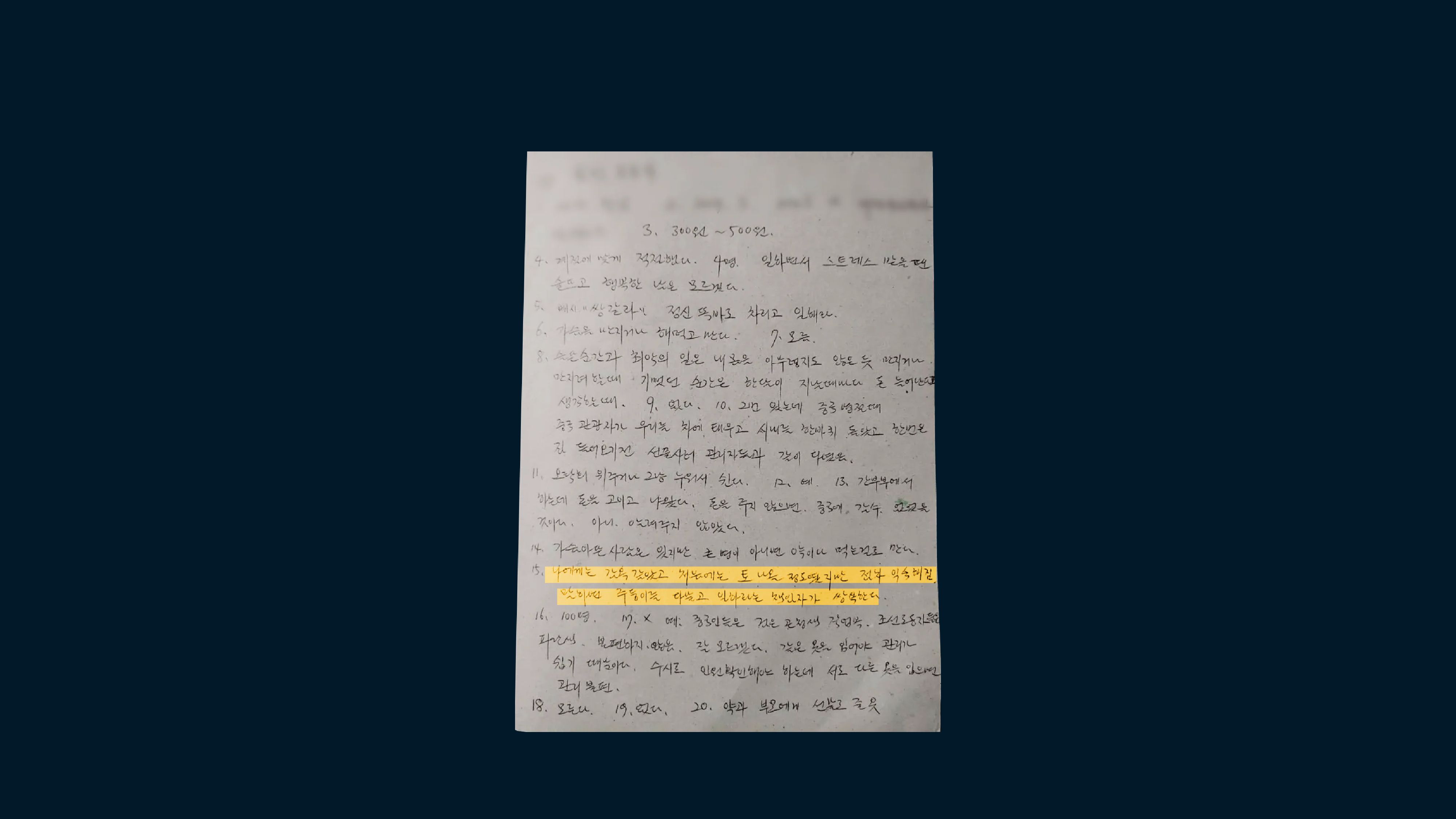 在工人们的回答中,他们描述了令人窒息的禁闭和深深的孤独。工作艰苦,工厂气味难闻,暴力行为普遍。一位在丹东海鲜加工厂工作了5年的工人写道:“他们踢我们,把我们当作非人类对待。”当我询问女性工人是否能回忆起任何快乐时刻时,大多数人表示没有,但几乎所有人都有悲伤的经历可讲述。一位最近返回朝鲜的工人表示,她在中国工厂的经历让她“想要死”。最引人注目的共同点是女性对工厂内性虐待的描述。在我采访的20名工人中,17名表示曾遭到工厂经理的性侵犯。3名女性称,她们的经理曾强迫她们从事卖淫。