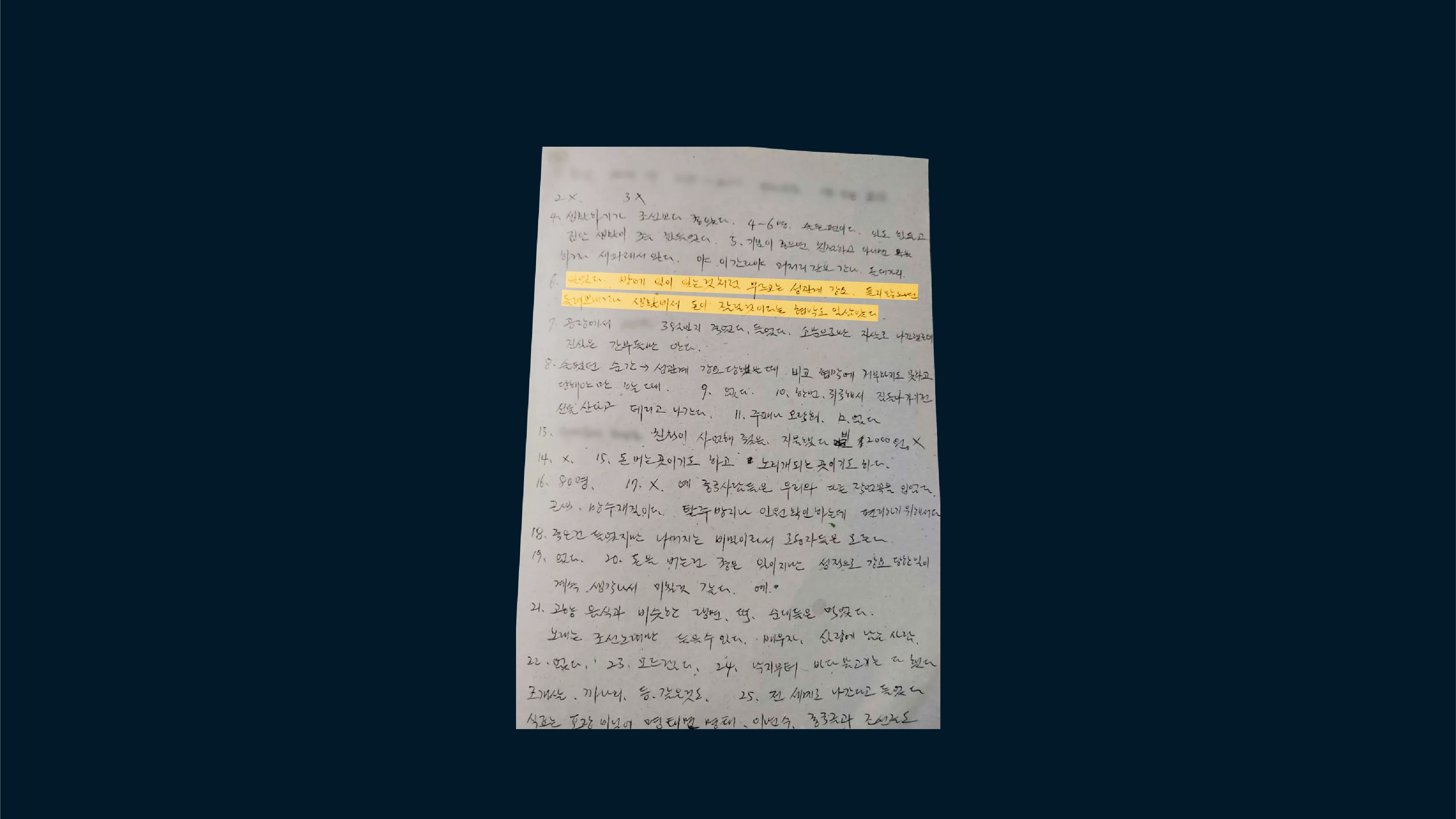 所有工人都被告知,他们的回答将由一家美国的新闻机构公开,且他们已同意此事。工人们冒着巨大的个人风险写下回答,调查员随后拍摄这些回答并将照片发送给我。为保护工人免受朝鲜或中国当局的报复,交接细节在团队内部也被严格保密。收到书面回复后,我邀请一位独立专家审核这些回答,以验证工人的用词和回答性质的真实性。