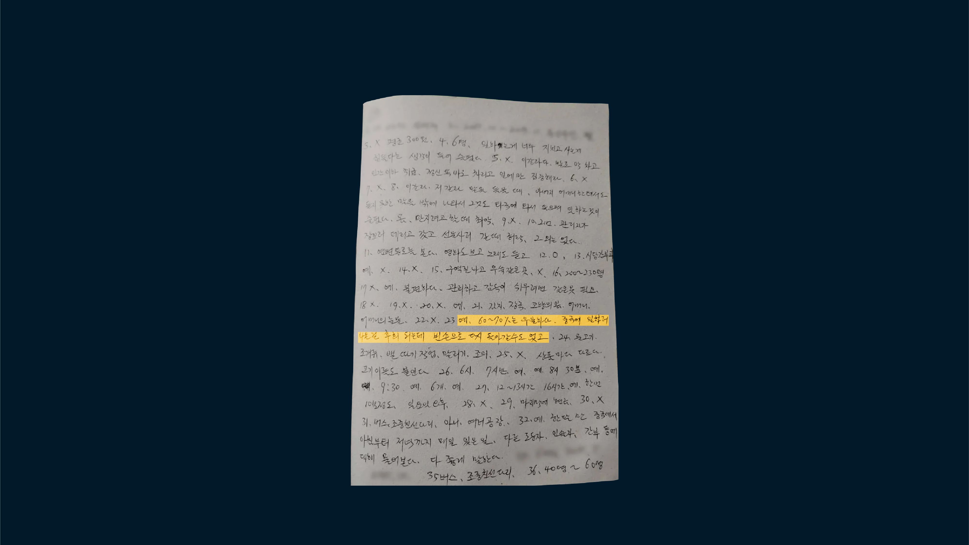 去年底,我与中韩调查员合作,编制了一份名单,列出了20多名曾在中国海鲜加工厂工作的人。大多数人已返回朝鲜,但有些仍在工厂工作。我们选择了不同年龄和来自朝鲜各地的工人。我列出了一些问题,然后在几周内,我们的朝鲜和中国调查员秘密地将这些问题传递给了这些工人。
