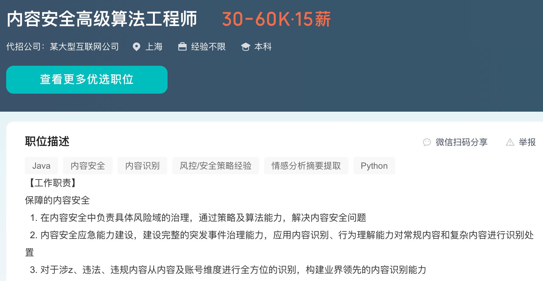 根据《财新》的消息,小红书正在面临巨大的内容审核压力,或许考虑隔离海内外IP来控制风险。这一点不难验证,根据网传截图,小红书已经在招聘网站上,通过派遣公司急招英文内容审核员,月薪7-9千人民币,承诺13个月薪水。不过再打开网站,英文、急招两字已被去掉,薪水变为4-8k,上岗日期则为2月10日。某大型互联网公司的内容安全高级算法工程师的招聘则高达月薪3-6万人民币,16薪。主要工作描述是“对于涉z、违法、违规内容从内容及账号维度进行全方位的识别,构建业界领先的内容识别能力”。