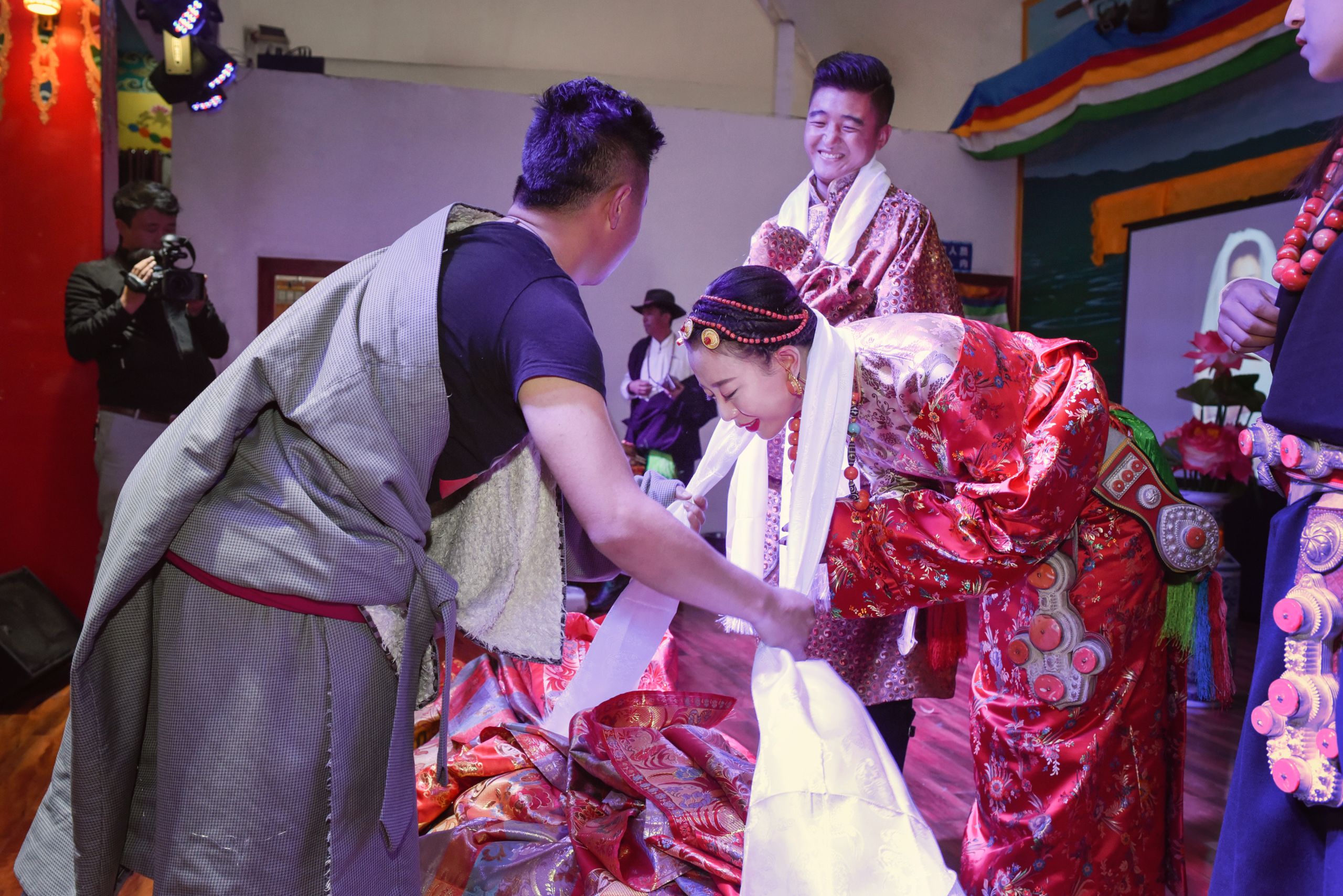 婚宴在一个藏式大厅内举行,除了拜父母、拜活佛,献上象征敬意与祝福的哈达也是仪式的一部分。亲朋好友们上前为新人献上各色哈达,有的长十几米,可以将新人围起来。这是很重要的参与过程,新人在其中接受众人的祝福。