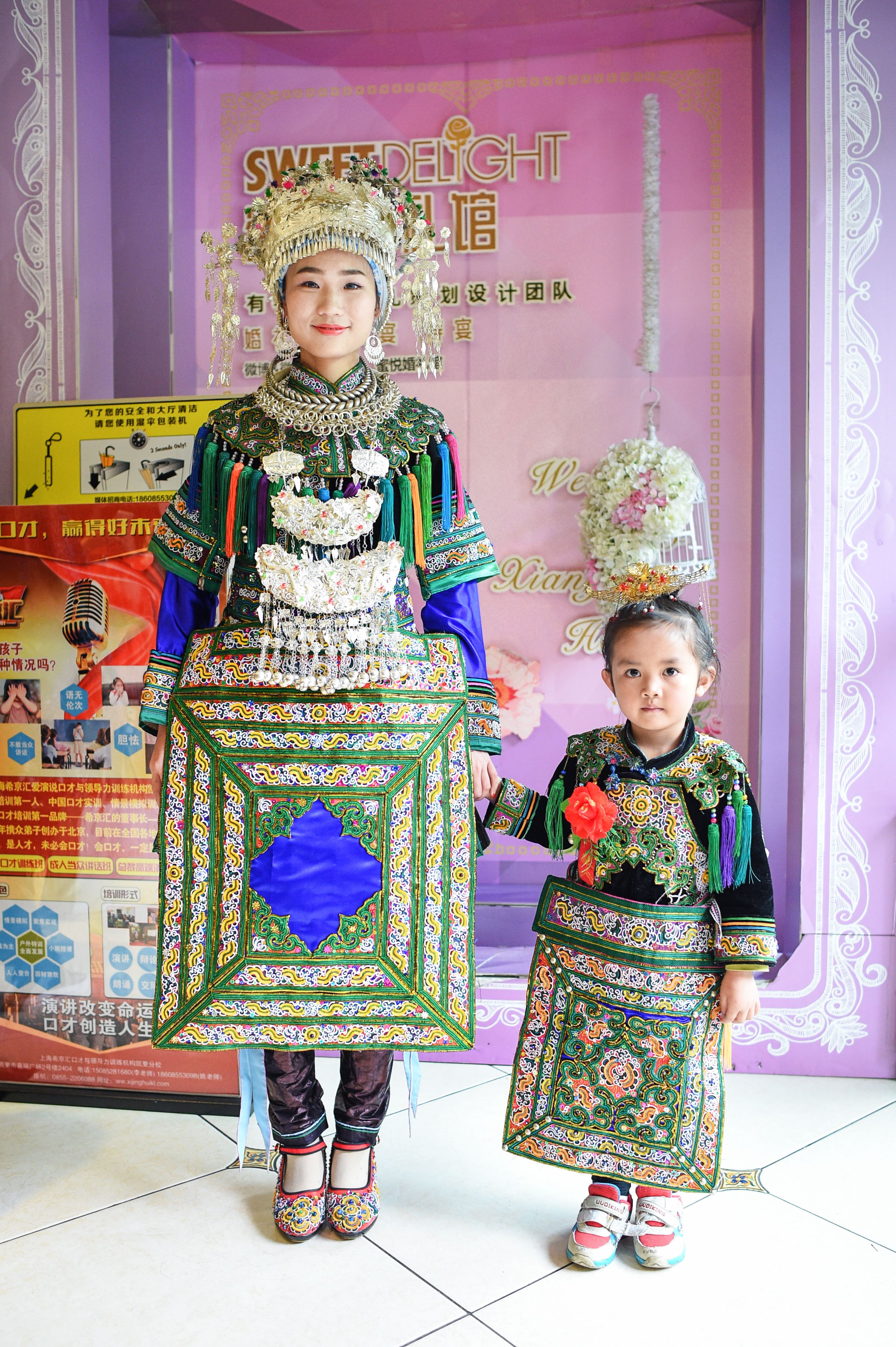 小段也见证了侗族和苗族之间的婚姻。这场婚礼采取了中西结合的仪式,接亲的方式又与汉族婚礼中常见的堵门相若。不过新娘迎宾时穿的盛装依然有很强的民族特色,帽子和饰品都是由银等金属制成,造型精致。