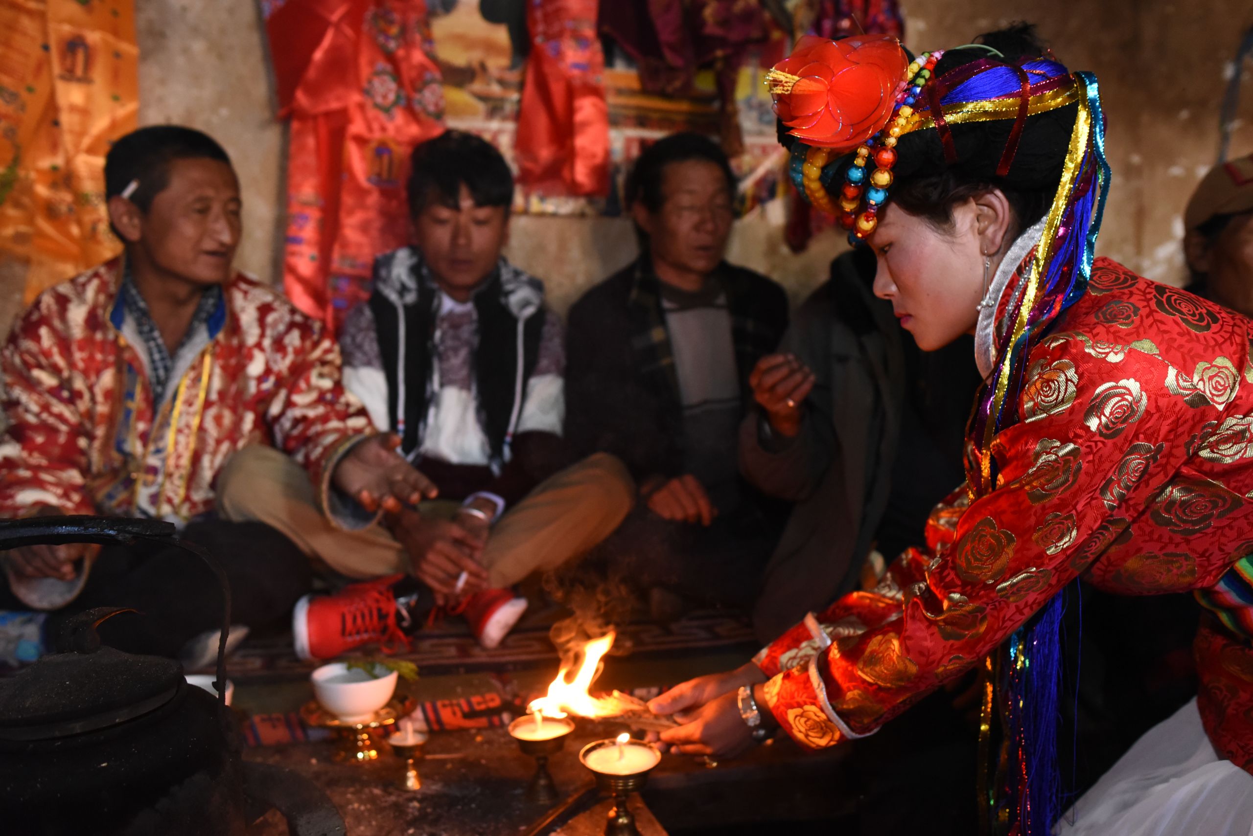 摩梭人家的院子类似简化版的四合院,有一个比较重要的区域是火塘,火塘可以生火取暖,也可以烧水做饭,还是人际交往、聚会议事、祭祀神灵之所。大喜之日,新郎穿黄色礼服,新娘穿红色礼服,婚礼上摩梭人的宗教仪式也是在火塘旁进行,由一位达巴(摩梭人信奉达巴教)主持,他口中念念有词,为新人做法事。