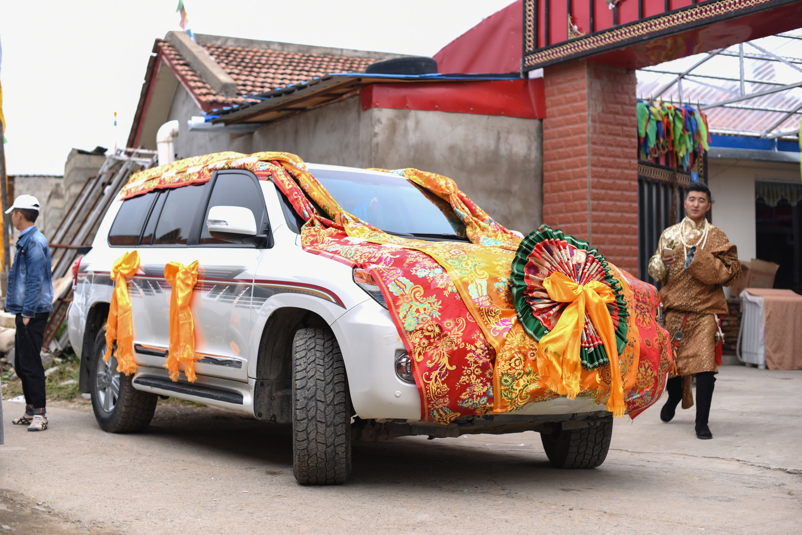 结婚当天,有贴了藏式装饰的车队,在接亲路上抛撒“龙达”——“龙达”是“风马”的藏语,风马旗(片)上印制着图形和经文,传达着各式寄望。新人穿上专门定制的隆重藏装,藏装的穿着非常讲究,服饰比较复杂,配饰也很多,需要有人帮助才能穿好。